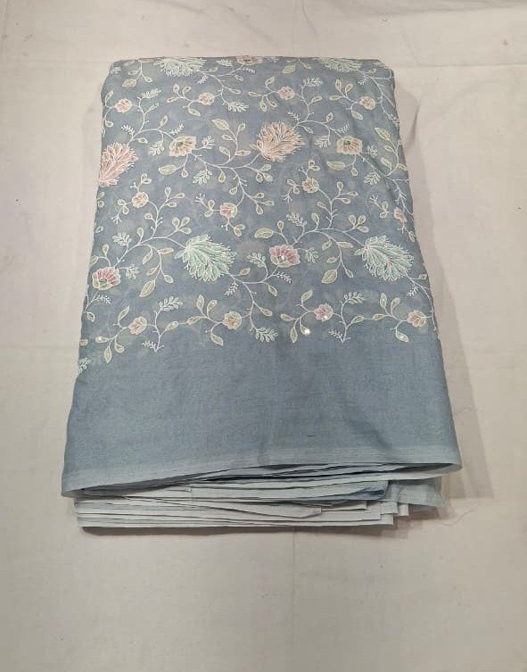 Blue Denim Cotton Work Fabric with White Floral Embroidery Soft Designer Dress Material