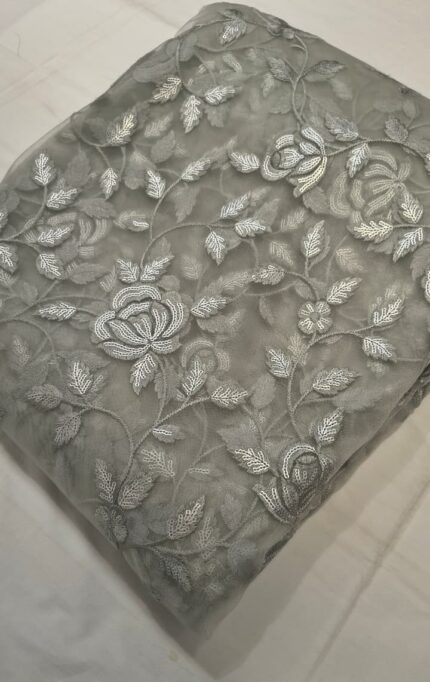 Premium Net Embroidery Fabric | Elegant Grey Embroidered Dress Material for Suit, Kurti & Party Wear