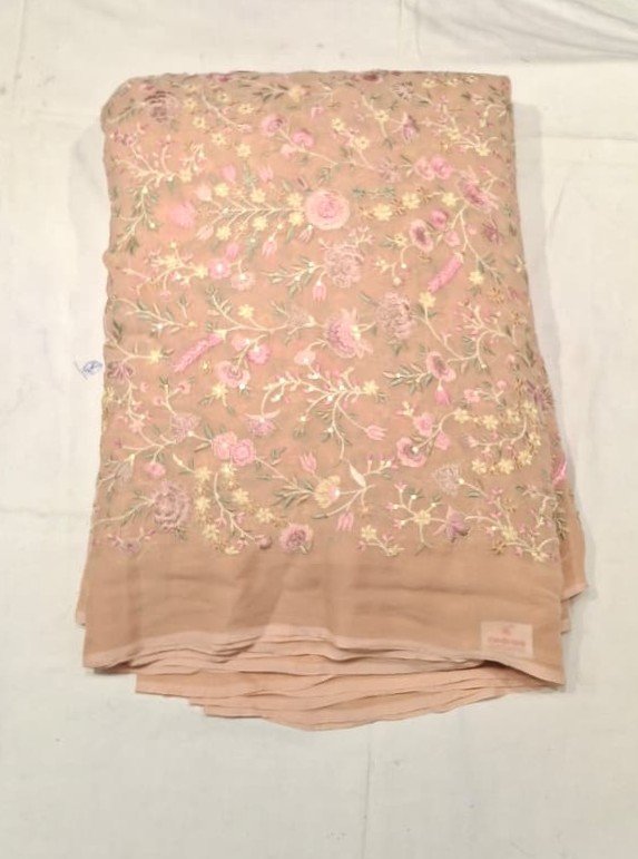 Premium Peach Georgette Embroidery Work Fabric with Floral Thread Detailing for Designer Ethnic Wear