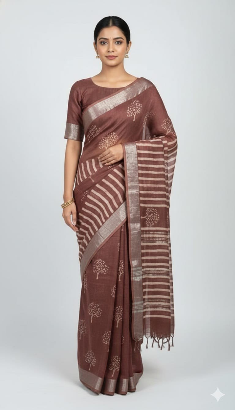 Premium Linen Cotton Printed Saree with Traditional Motifs, Rich Border and Elegant Pallu Lightweight Ethnic Wear