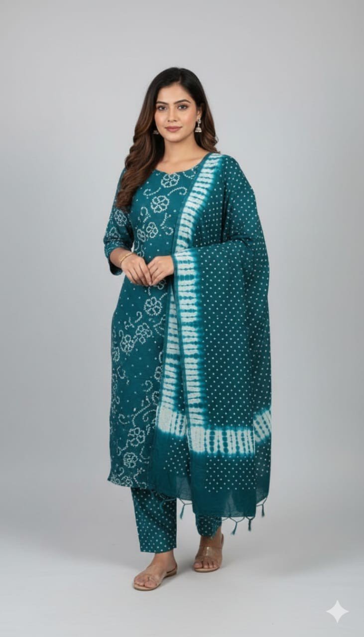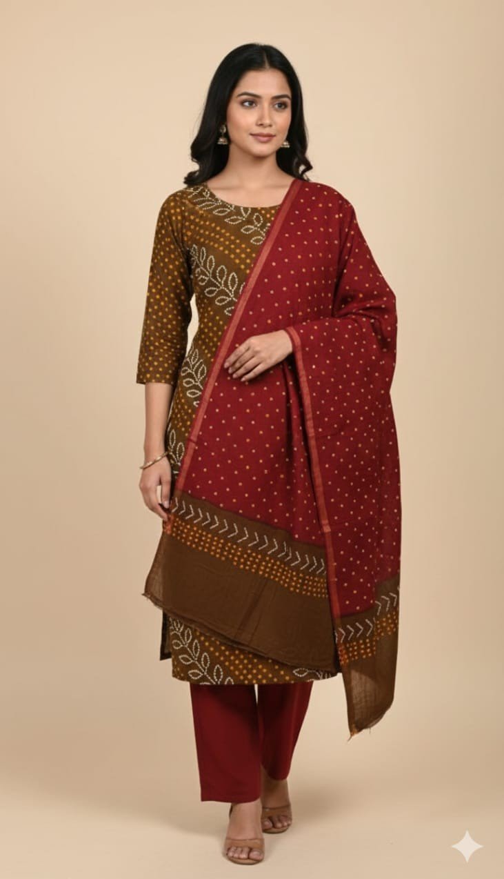 Premium Bandhani Cotton Unstitched Suit Set with Shibori Dye Dupatta and Plain Cotton Bottom | Elegant Ethnic Wear for Daily & Festive Use