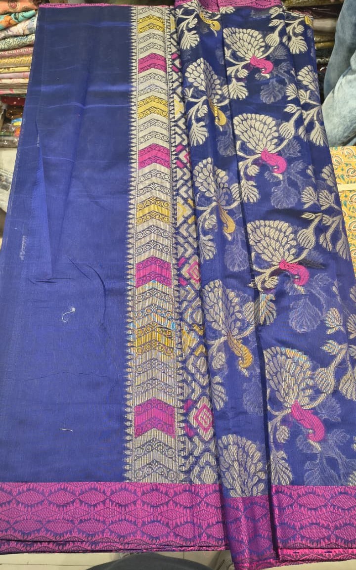 Add timeless elegance to your ethnic collection with this beautiful Baluchari Cotton Saree, crafted in a rich deep blue shade with intricate traditional woven motifs. This saree features classic Baluchari-inspired designs along with contrasting zari work borders that enhance its royal appeal.