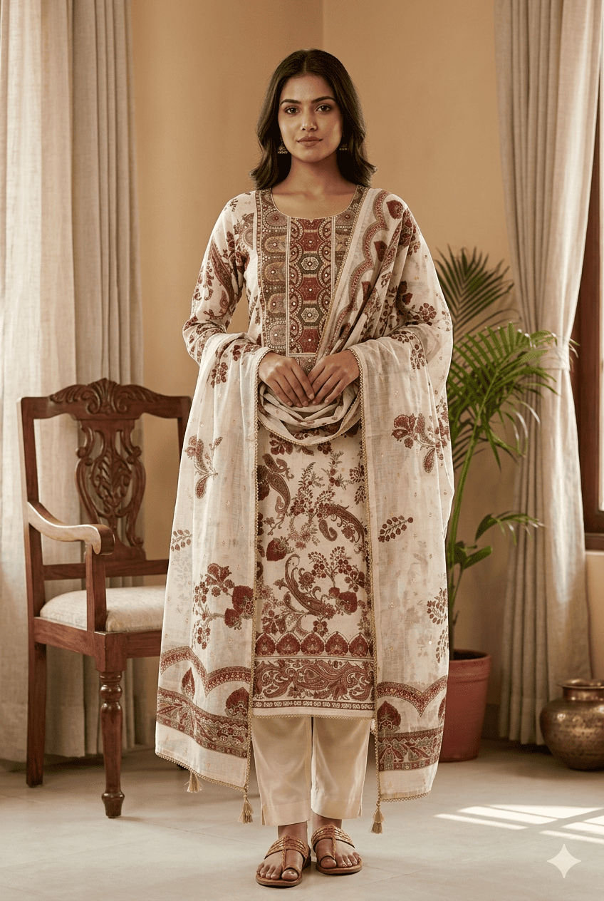 This premium Chanderi Cotton 3 Piece Suit Set is designed for a graceful and elegant ethnic look. The set includes Suit, Dupatta and Bottom, making it a complete outfit for festive, party and special occasions.