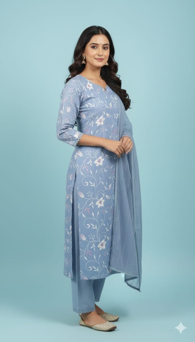 Add subtle elegance to your ethnic wardrobe with this Chikankari Work Suit Set crafted in soothing pastel tones. The kurta features delicate chikankari embroidery that gives a graceful and refined look. Paired with a pure cotton embroidered dupatta and a matching cotton bottom, this suit set is perfect for everyday ethnic wear as well as special occasions.