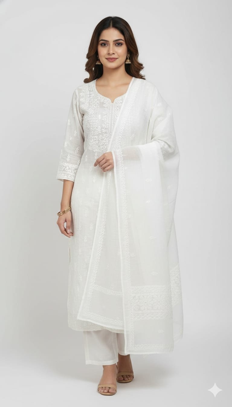 This Cotton Kota Chikankari Work Suit Set reflects timeless elegance with a soft, graceful, and soothing ethnic appeal. Crafted from premium quality Cotton Kota fabric, the kurta features delicate Chikankari embroidery on the neckline and front panel, giving it a refined and classy look.