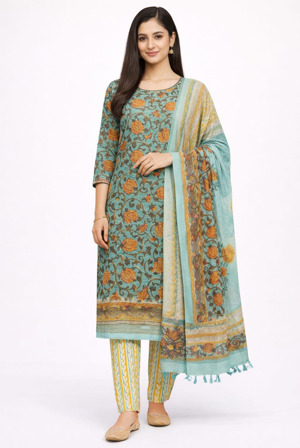 Some images used for presentation may include AI-generated model images. Actual product color, print placement, fabric texture, and dupatta design may vary slightly. Please refer to real product images for accurate details.
