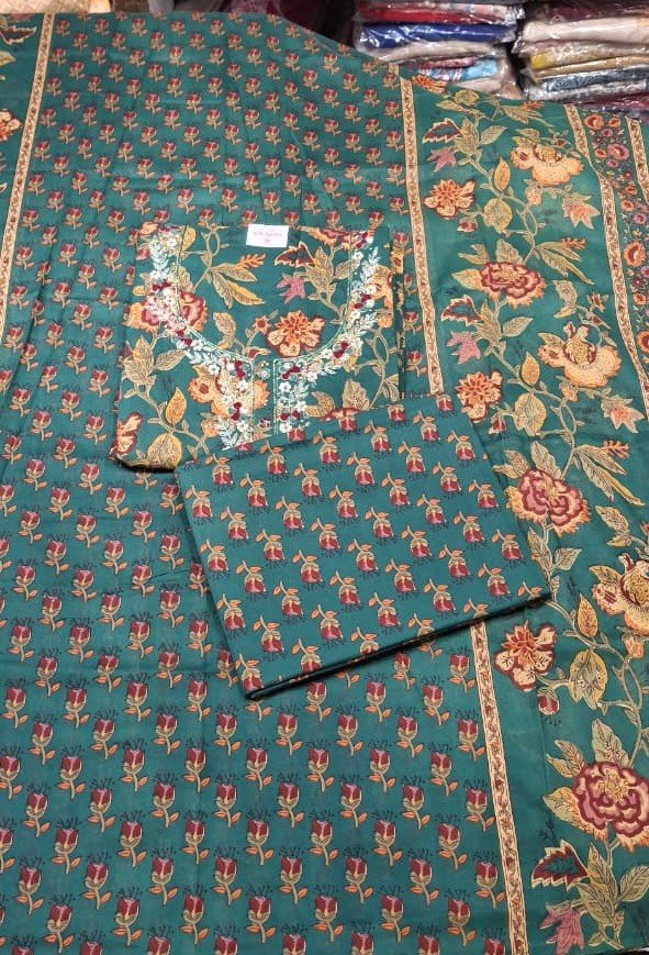 The suit is paired with a cotton printed dupatta that adds grace and completes the traditional look effortlessly. The matching cotton bottom fabric ensures all-day comfort, making this set suitable for regular wear as well as special casual occasions.