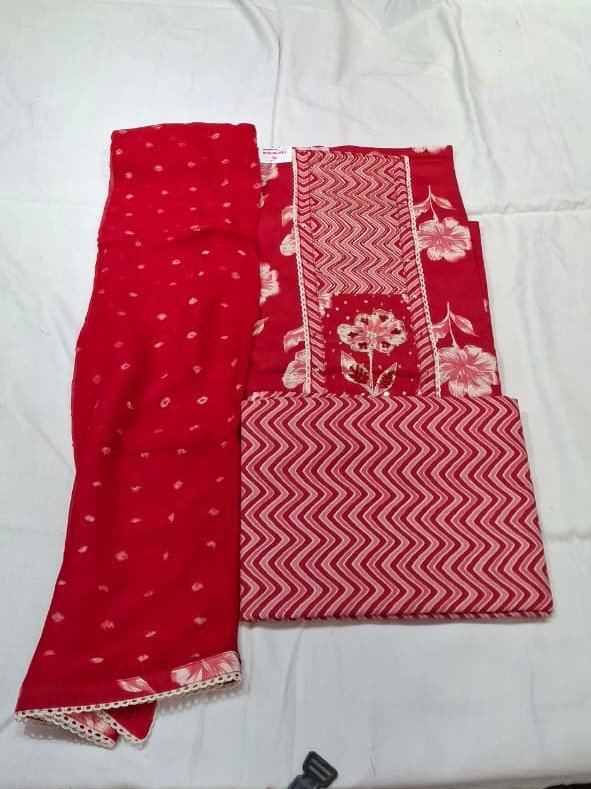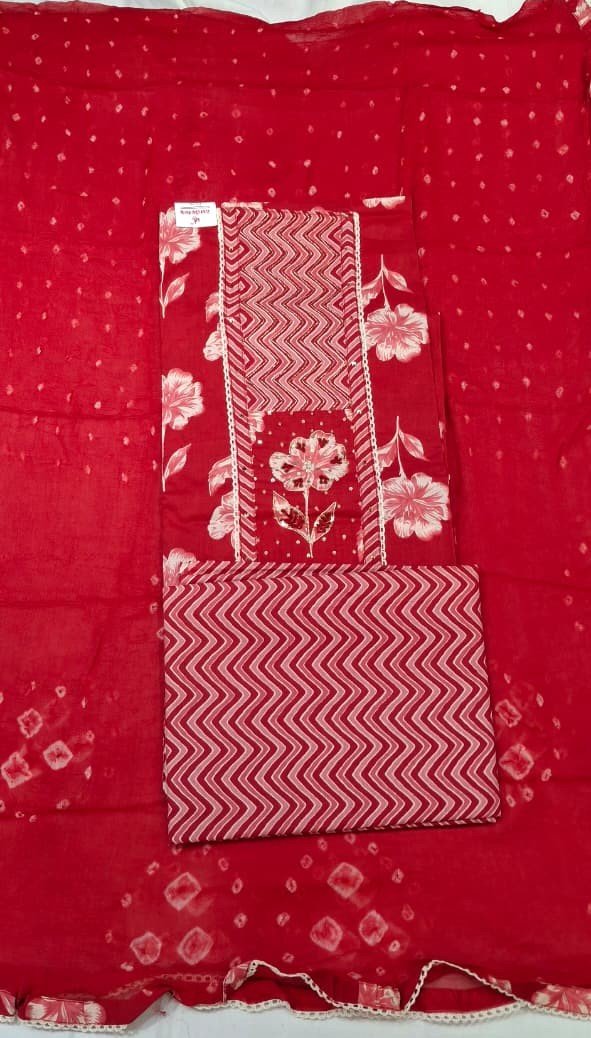 The suit is paired with a lightweight Bandhej printed chiffon dupatta, adding a soft, flowy touch and enhancing the overall look. The matching cotton printed bottom ensures all-day comfort and breathability, making this suit ideal for everyday wear.