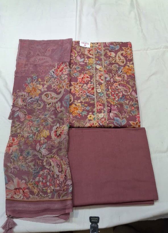 Pure All Cotton Suit Set with Printed Cotton Dupatta and Cotton Bottom Elegant Embroidered Unstitched Dress Material