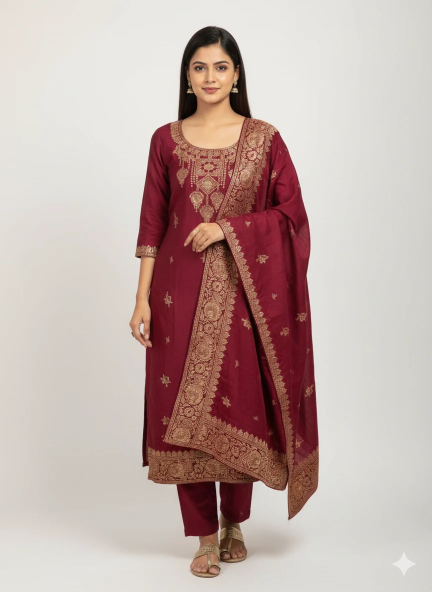 Enhance your festive wardrobe with this elegant Dulha Silk Unstitched Suit Set. Crafted from premium Dulha silk, the kurta fabric features rich zari work that adds a royal and graceful touch. The set comes with a beautifully coordinated Dulha silk dupatta and a comfortable glace cotton bottom, making it ideal for weddings, festivals, and special occasions.