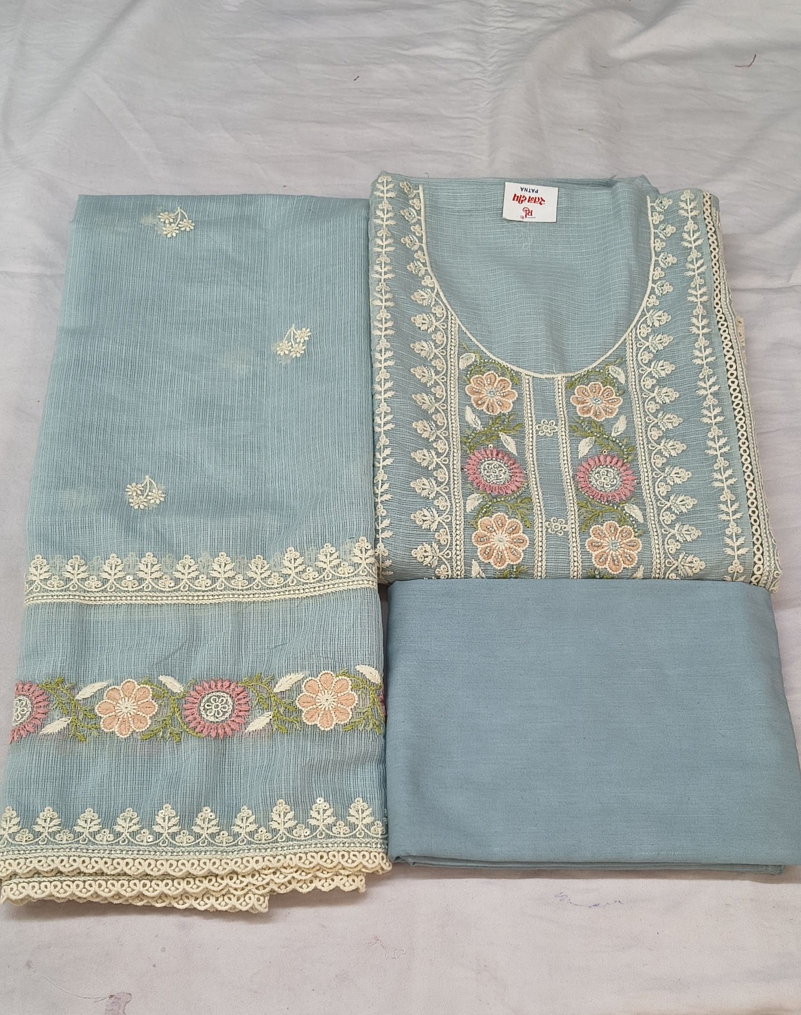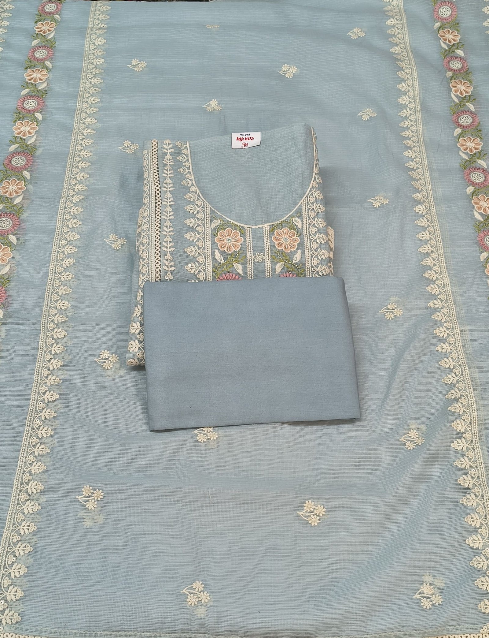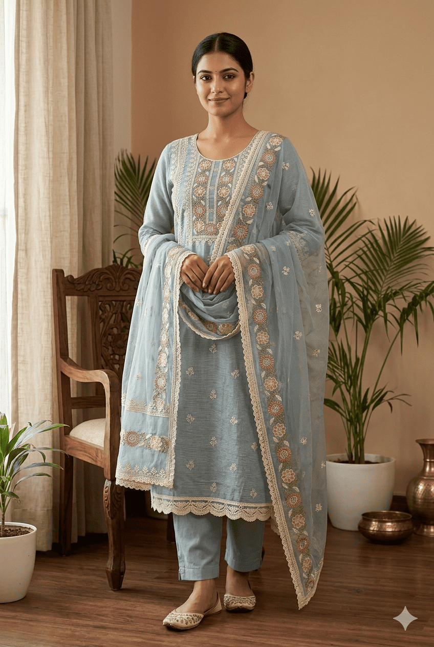 The suit features delicate embroidery work with subtle detailing, giving it a rich and graceful appearance. The lightweight Kota cotton fabric ensures breathability and comfort, making it perfect for daily wear as well as small festive occasions.