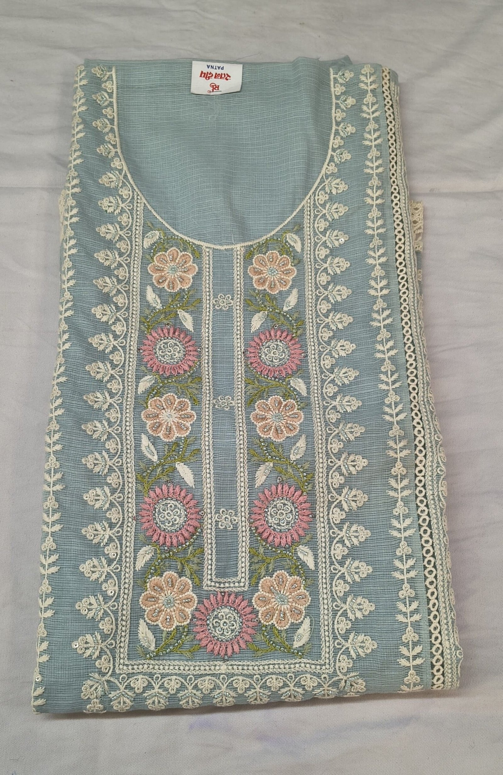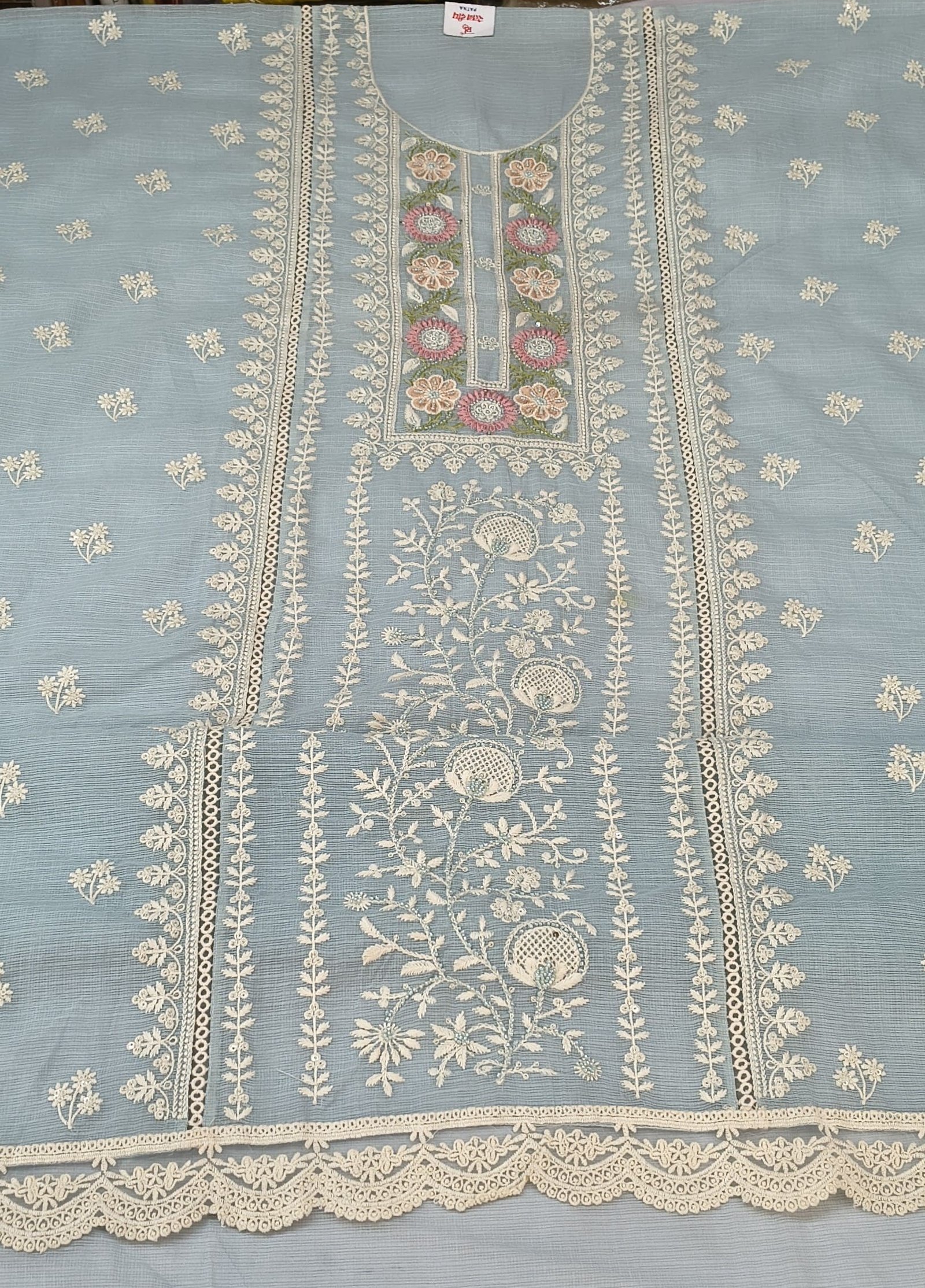 The dupatta comes with beautiful embroidery design and scalloped border, enhancing the overall look of the outfit. Paired with a soft cotton bottom, this set is ideal for stitching into a stylish suit as per your preference.