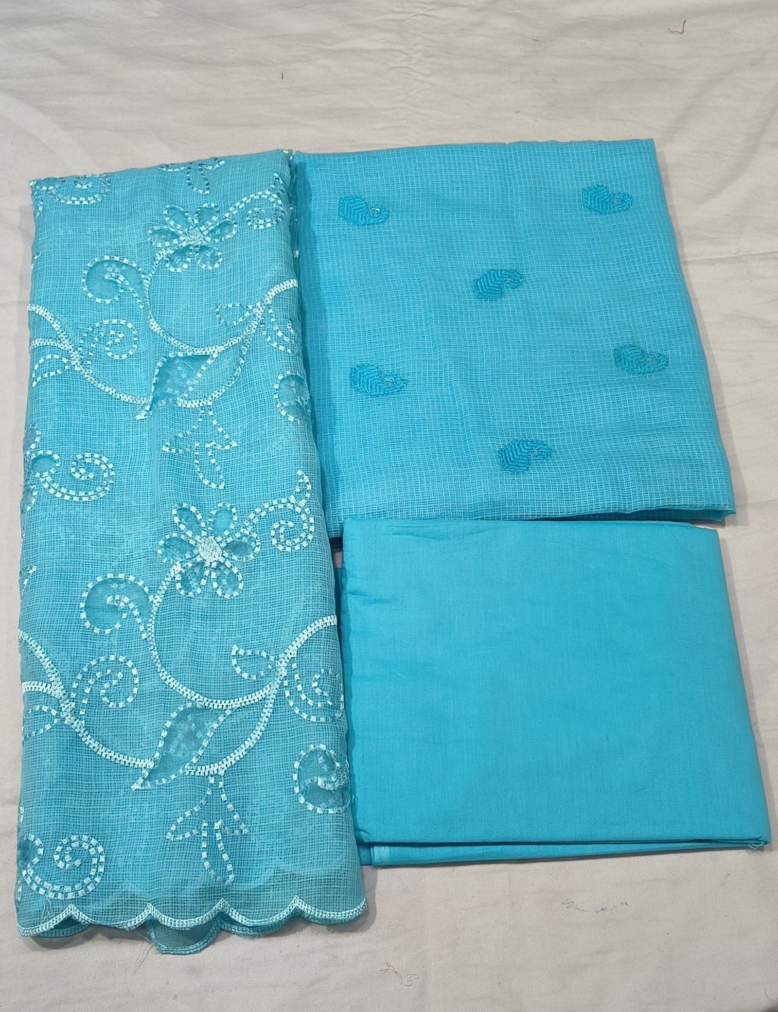 The suit features delicate embroidery work with subtle detailing, giving it a rich and graceful appearance. The lightweight Kota cotton fabric ensures breathability and comfort, making it perfect for daily wear as well as small festive occasions.
