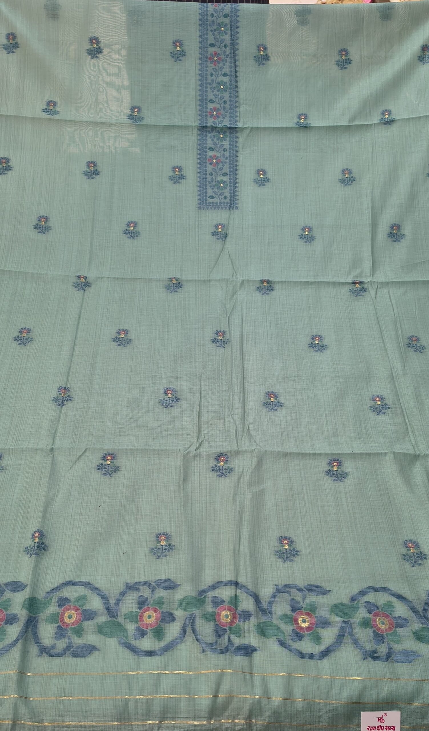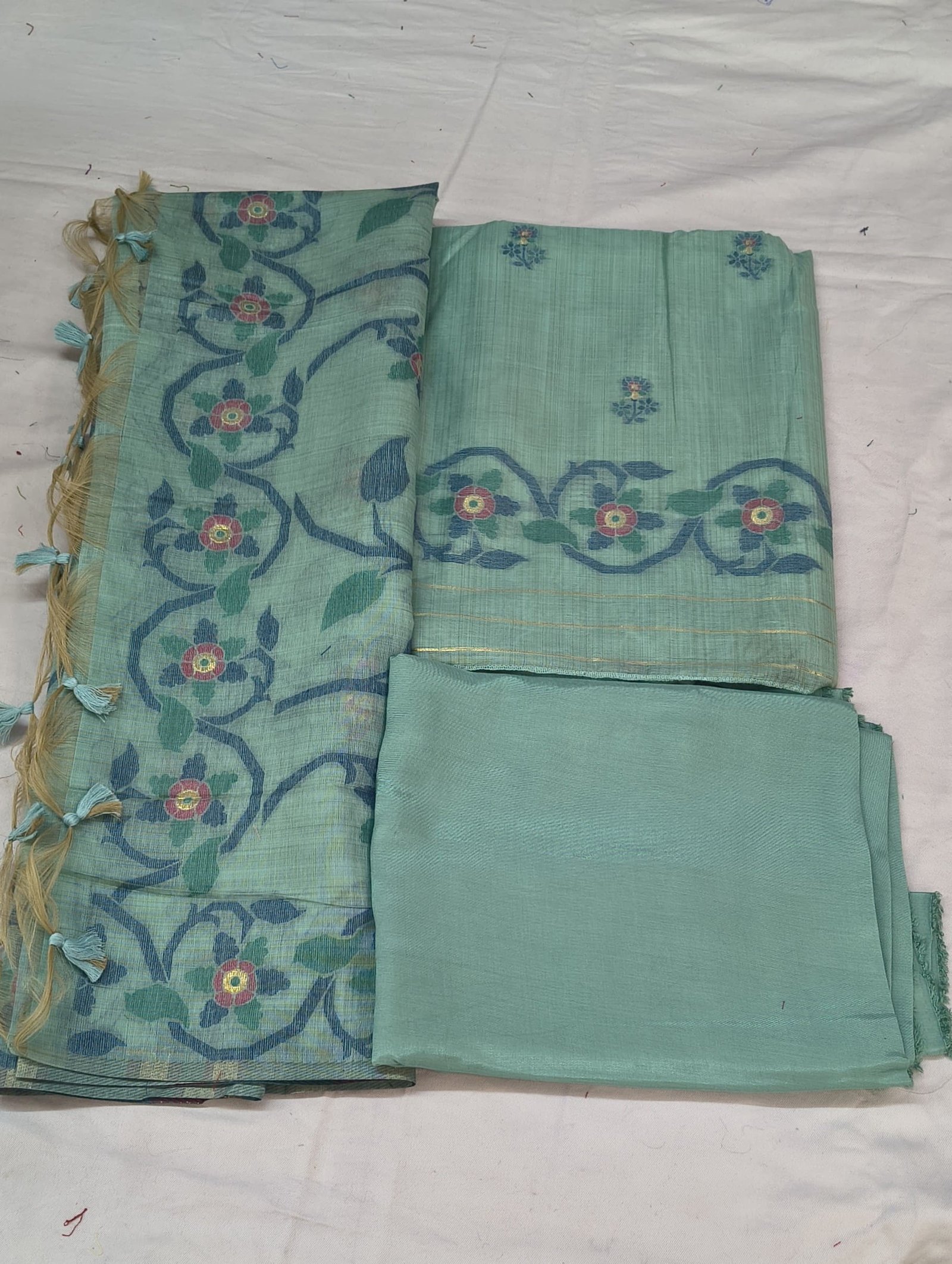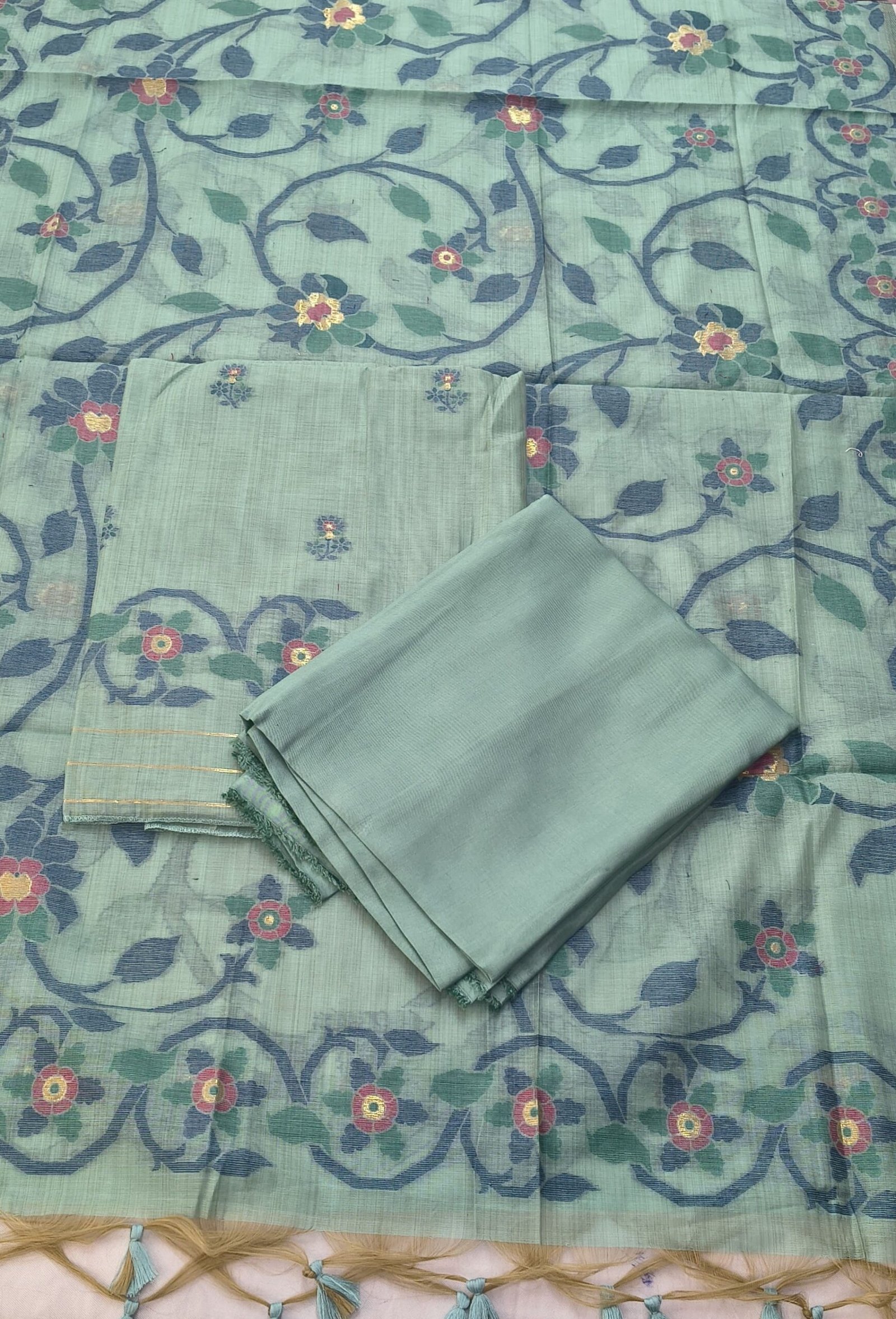 Enhance your ethnic collection with this beautiful Jamdani Cotton Suit Set, featuring a subtle cream base with elegant teal floral motifs. The intricate Jamdani weaving gives it a rich traditional look with a modern touch.