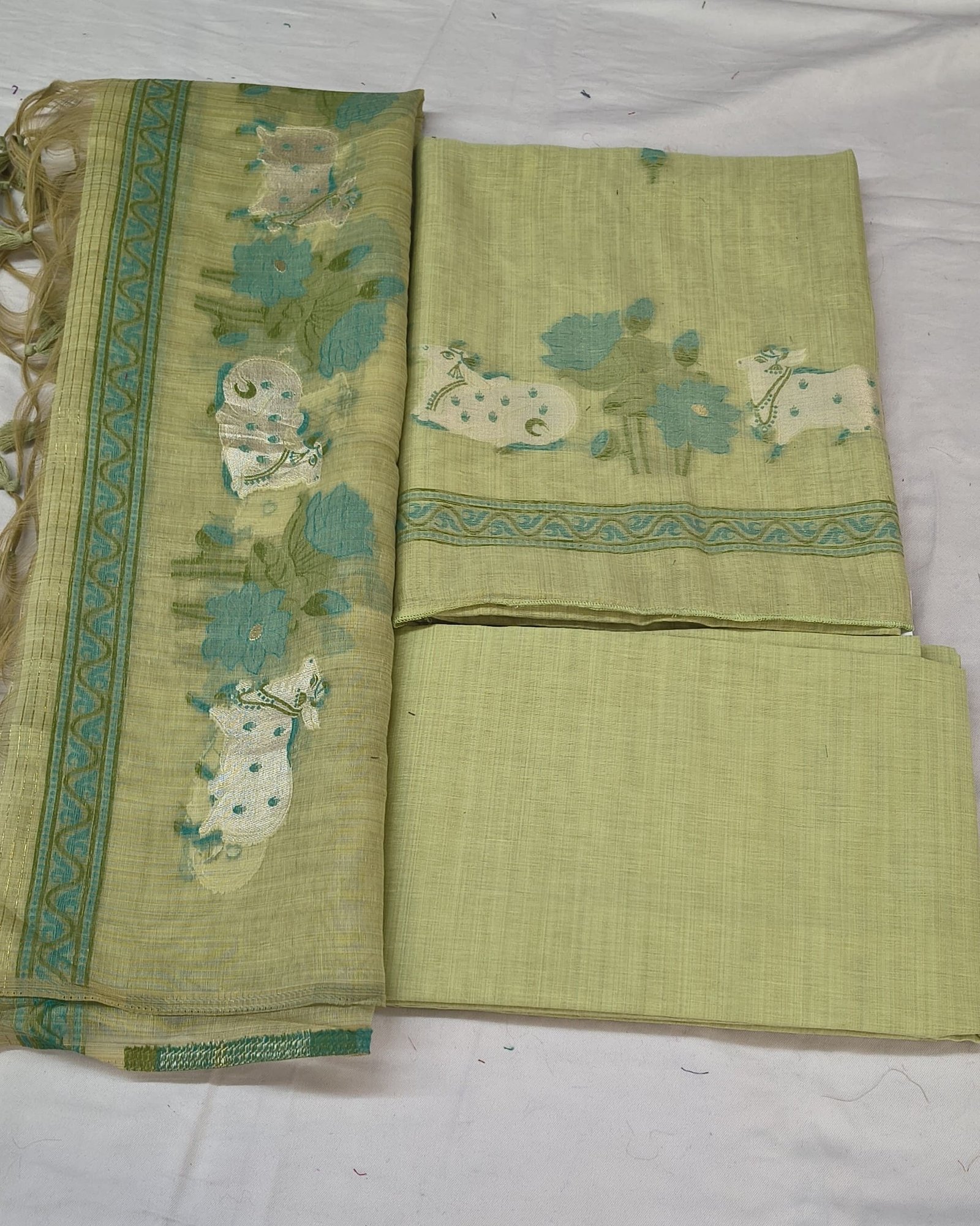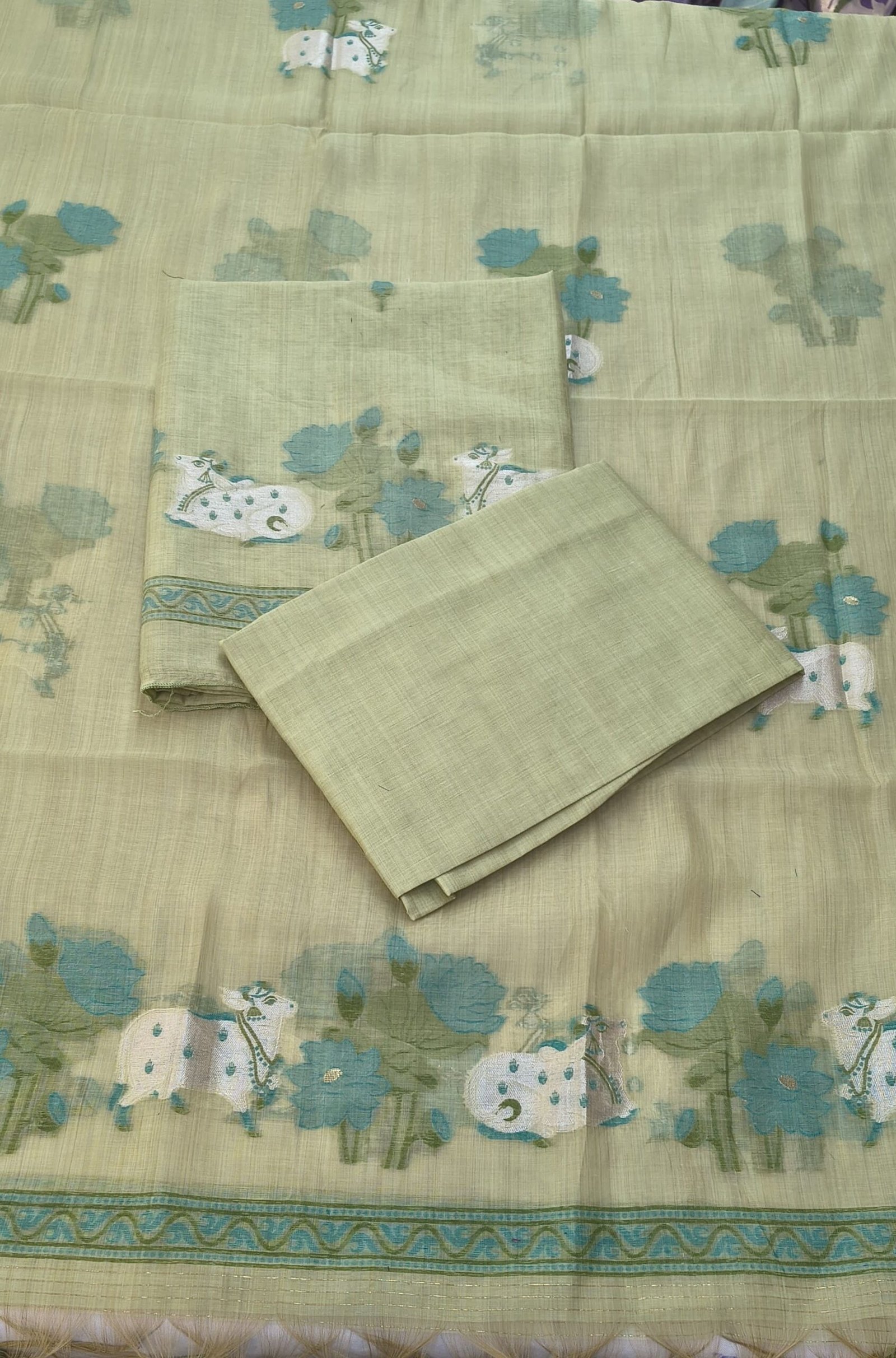 Enhance your ethnic collection with this beautiful Jamdani Cotton Suit Set, featuring a subtle cream base with elegant teal floral motifs. The intricate Jamdani weaving gives it a rich traditional look with a modern touch.