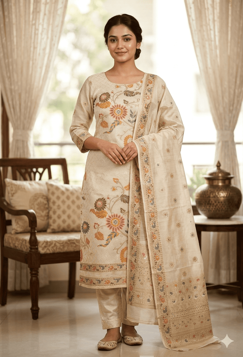 Upgrade your ethnic style with this premium Tissue Silk Suit set, designed with elegant floral prints and a soft glossy finish that gives a rich and classy look. Perfect for festive occasions and special events.