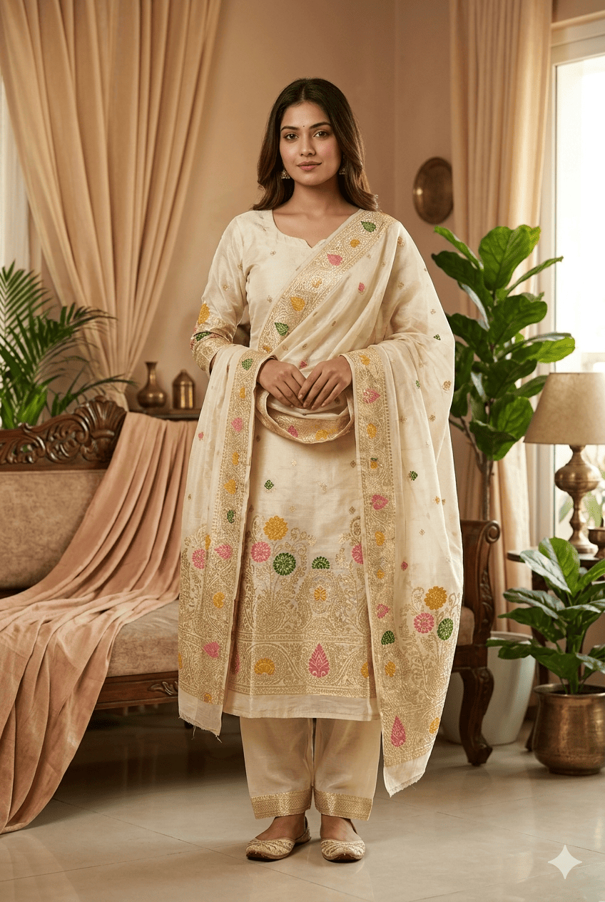 Upgrade your ethnic style with this premium Tissue Silk Suit set, designed with elegant floral prints and a soft glossy finish that gives a rich and classy look. Perfect for festive occasions and special events.