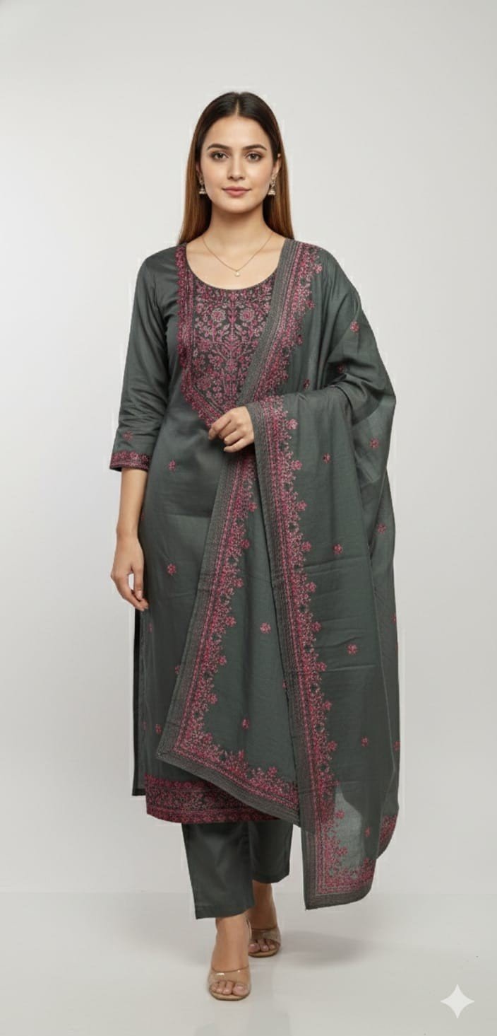 This Grey Cotton Work Suit Set is a graceful blend of elegance, comfort, and traditional craftsmanship. The kurta fabric is made from premium cotton, beautifully enhanced with intricate embroidery work that adds a rich and classy ethnic appeal.