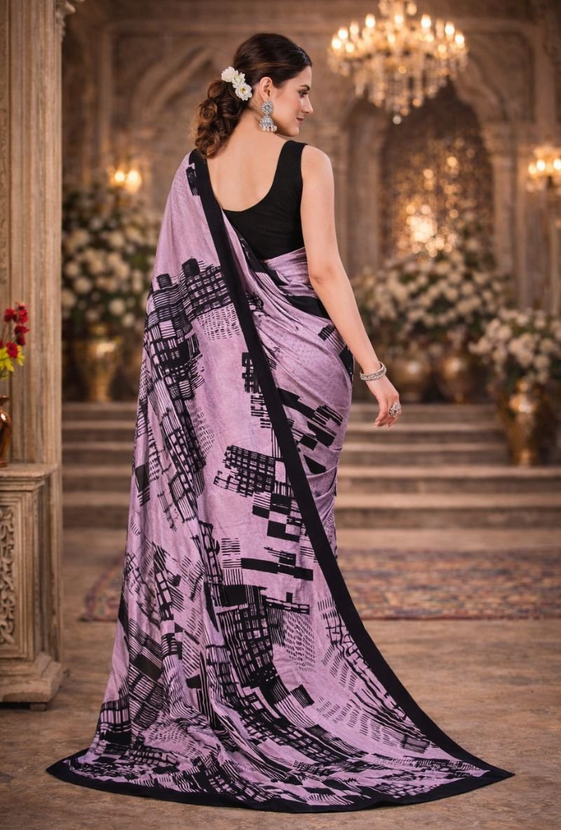 This stylish Italian Crepe Saree features a modern abstract printed design that gives it a bold and trendy look. The combination of large artistic patterns on the pallu and elegant dotted print on the pleats makes this saree unique and fashionable.