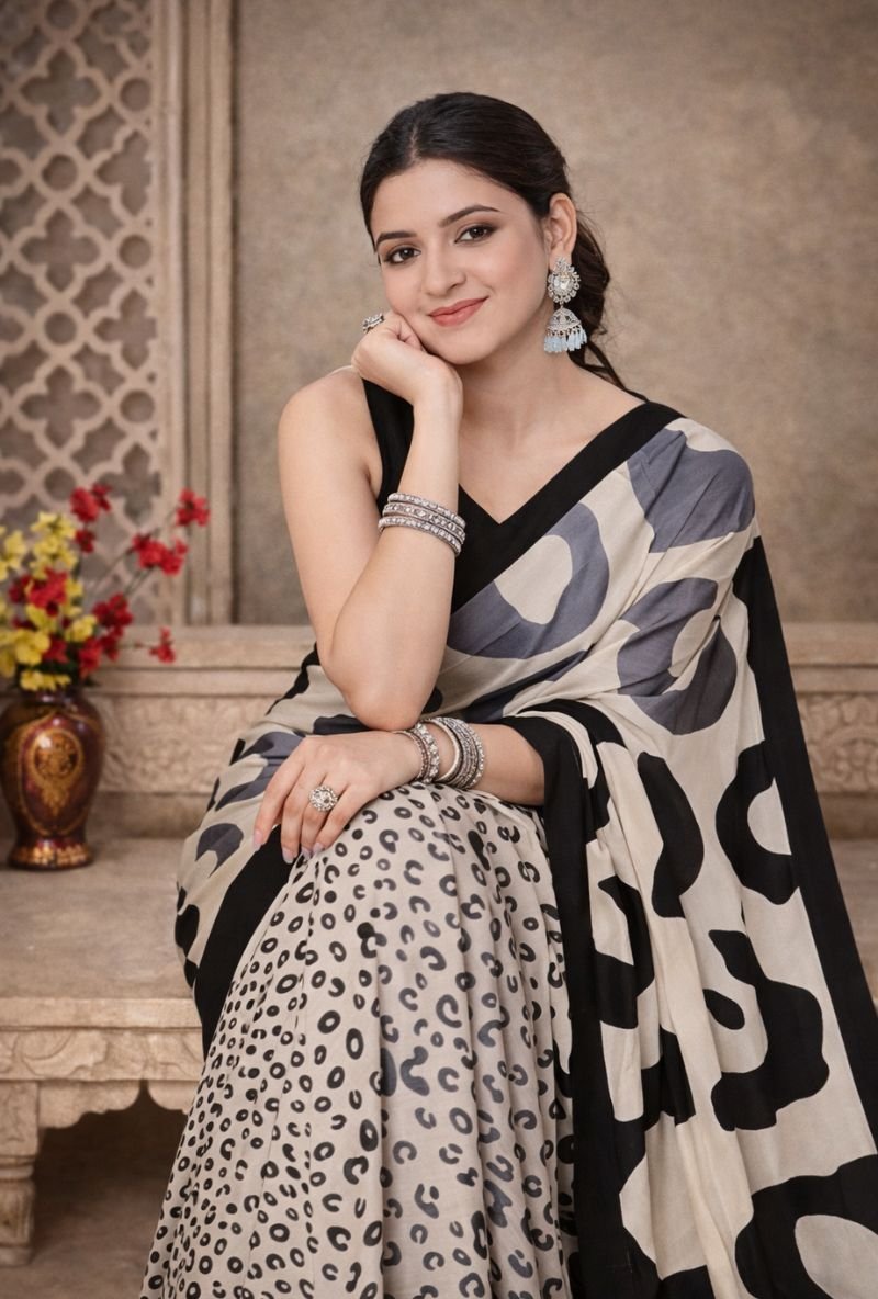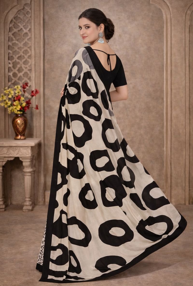 This stylish Italian Crepe Saree features a modern abstract printed design that gives it a bold and trendy look. The combination of large artistic patterns on the pallu and elegant dotted print on the pleats makes this saree unique and fashionable.