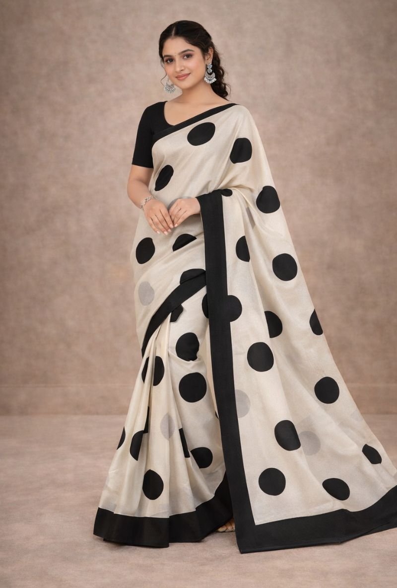 This stylish Italian Crepe Saree features a modern abstract printed design that gives it a bold and trendy look. The combination of large artistic patterns on the pallu and elegant dotted print on the pleats makes this saree unique and fashionable.