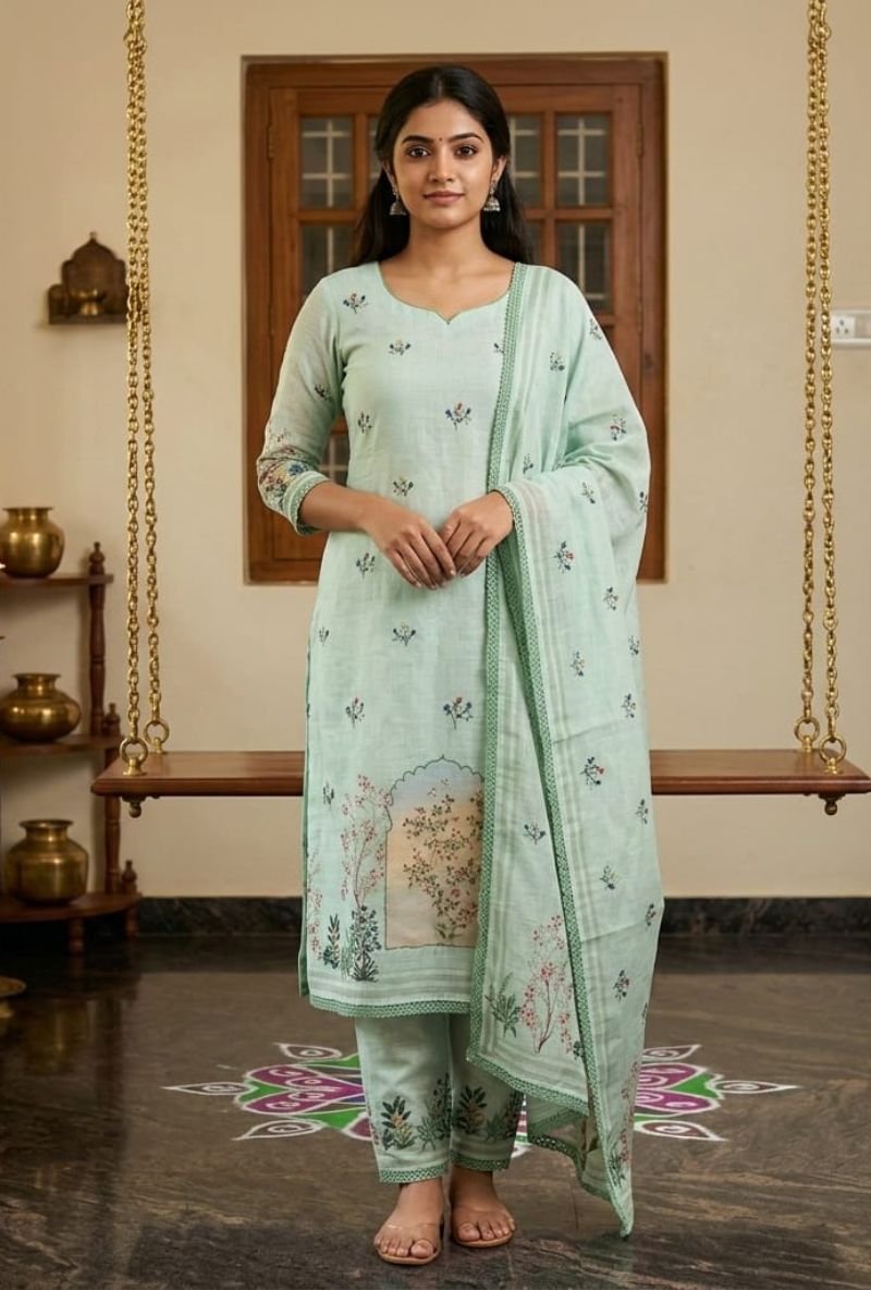 This Linen Cotton Suit Set is a perfect combination of elegance and comfort. The kurta is crafted from premium linen cotton fabric and features beautiful floral embroidery on the neckline along with subtle woven motifs across the fabric, giving it a rich and graceful ethnic look.