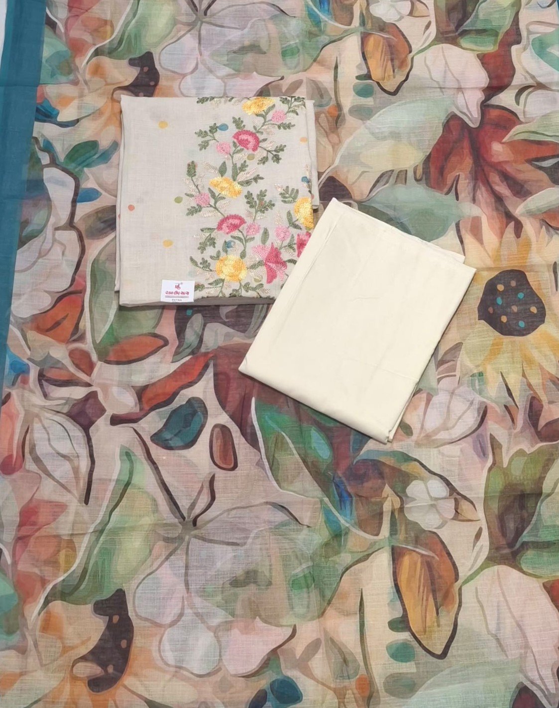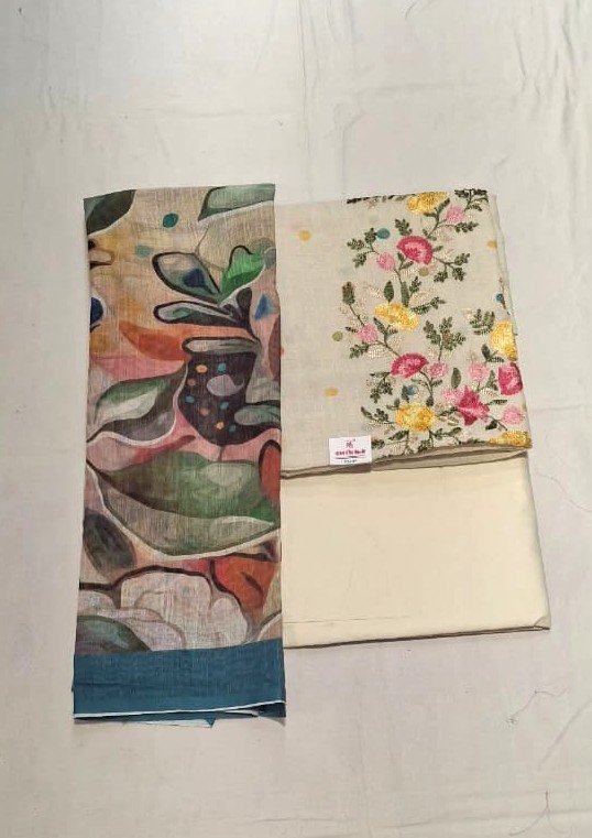 This Linen Cotton Suit Set is a perfect combination of elegance and comfort. The kurta is crafted from premium linen cotton fabric and features beautiful floral embroidery on the neckline along with subtle woven motifs across the fabric, giving it a rich and graceful ethnic look.