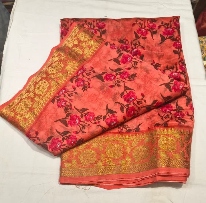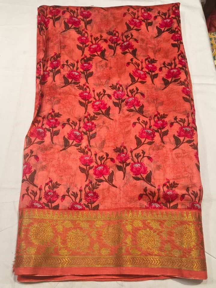 Enhance your ethnic wardrobe with this elegant Maheshwari Silk Saree, designed in a beautiful warm peach-orange tone with rich floral prints. The saree features a luxurious golden zari woven border that adds a regal and festive charm.