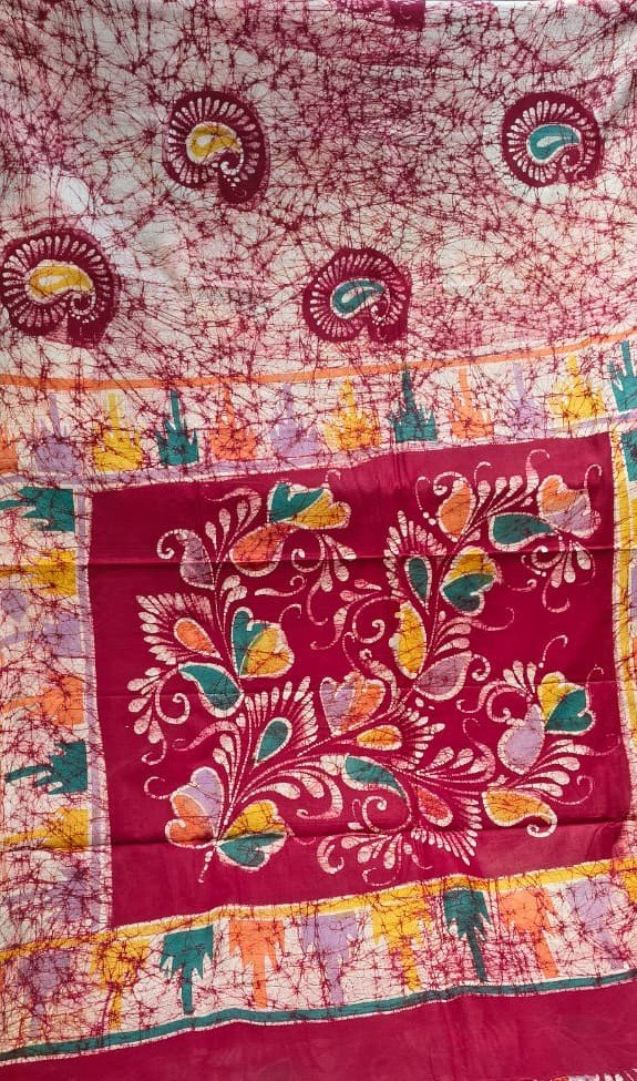 This beautiful Mal Cotton Saree is designed with a traditional batik style print and colorful designer pallu, giving it a vibrant and elegant ethnic look. The saree features unique artistic patterns across the body along with a decorative pallu that enhances its traditional appeal.