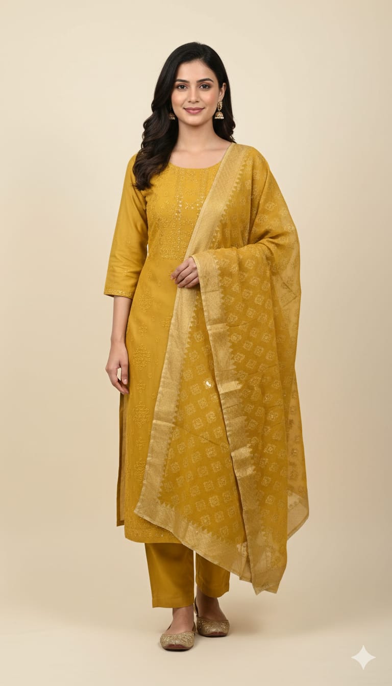 The set is paired with a beautifully embroidered Malkha silk dupatta, known for its soft texture and natural sheen, along with a comfortable cotton bottom fabric. This ensemble is perfect for festive occasions, traditional functions, office ethnic wear, and family gatherings.