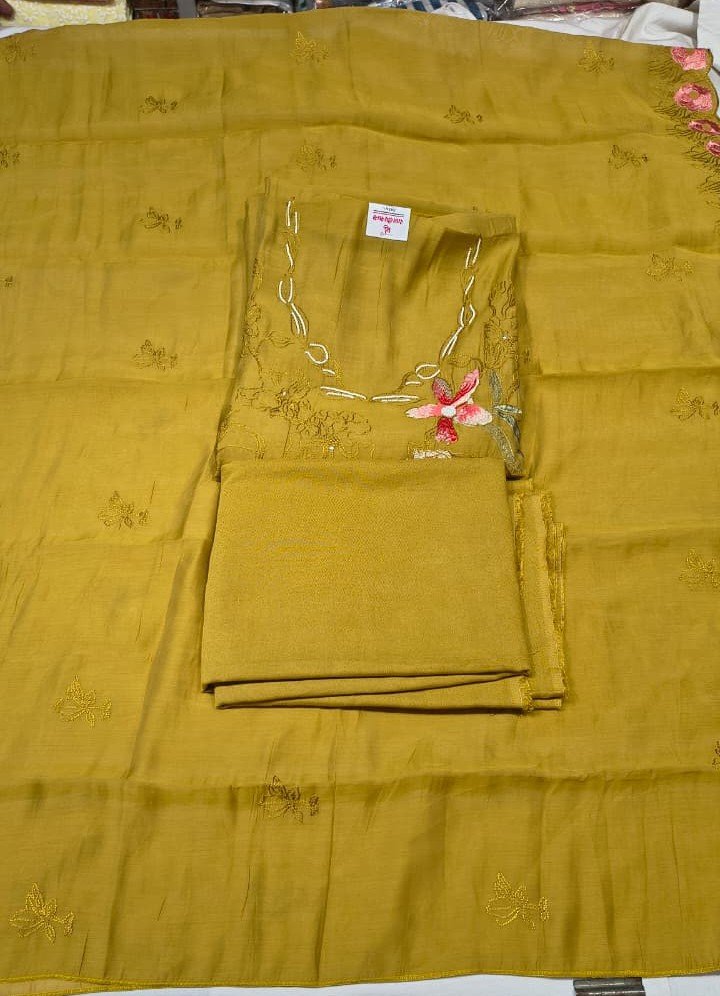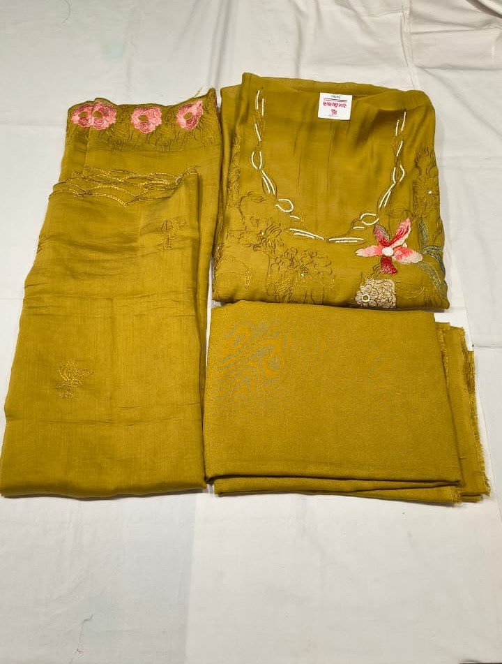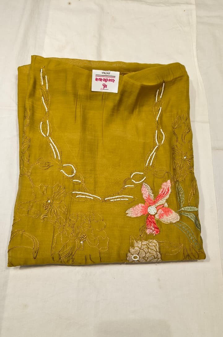 This Maslin Silk Moti Work Suit Set is a perfect blend of elegance, richness, and graceful craftsmanship. The kurta is made from premium quality Maslin silk fabric, beautifully enhanced with delicate moti work and floral embroidery, giving it a luxurious ethnic appeal.