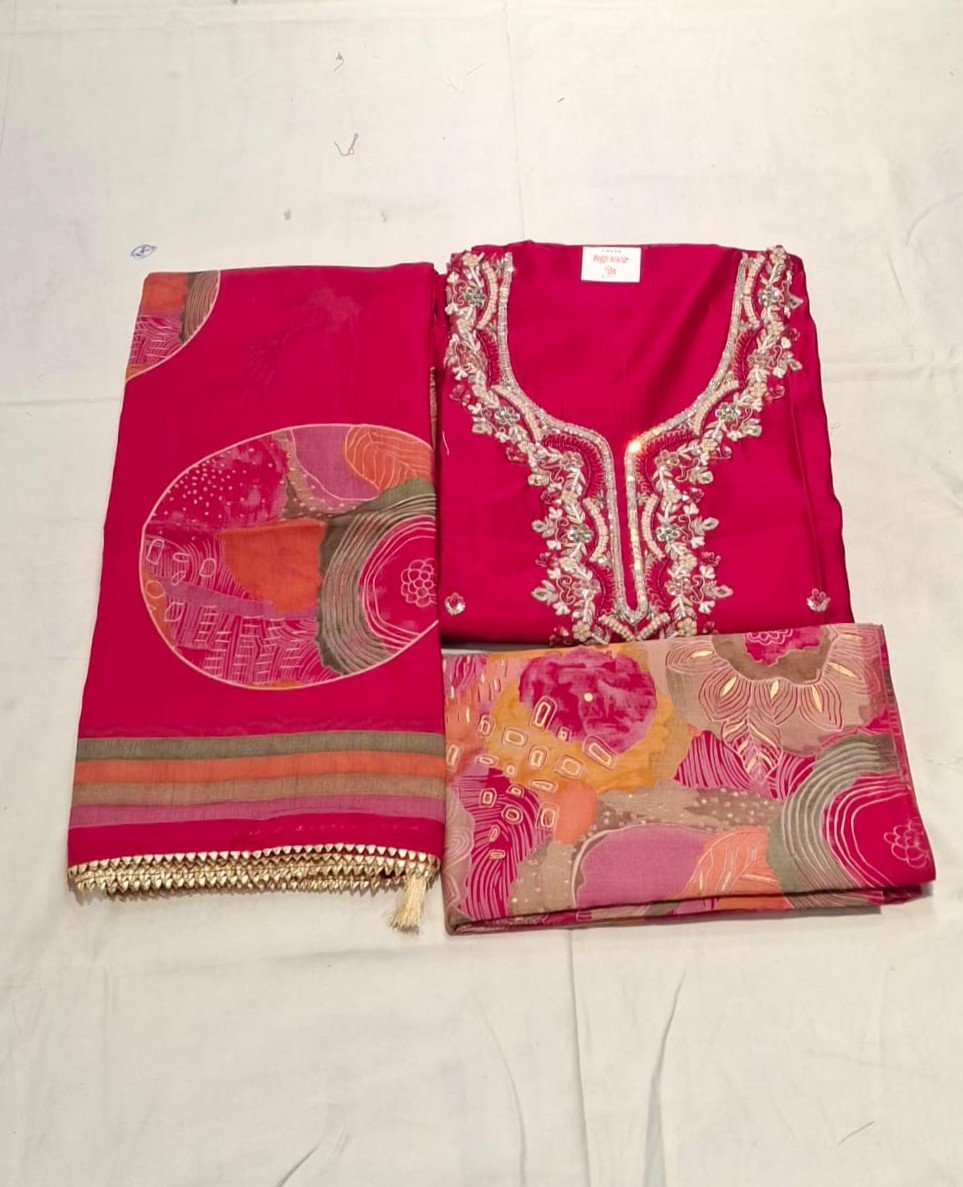 Maslin Silk Suit Set with Dola Silk Dupatta and Tapeta Bottom Elegant Embroidered Festive Unstitched Dress Material