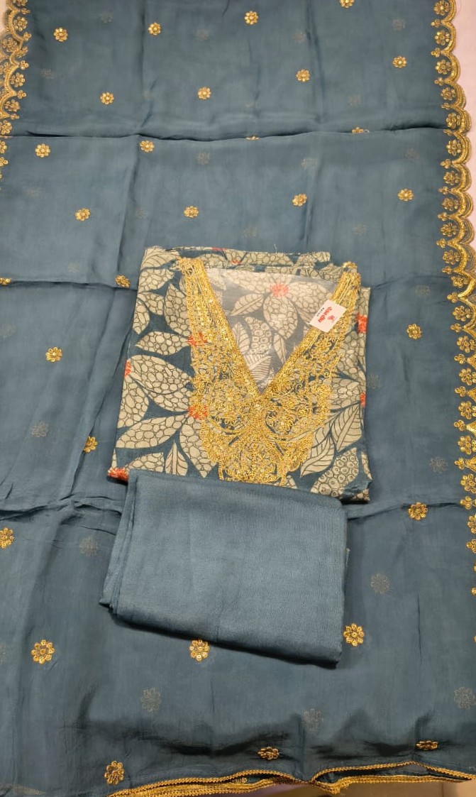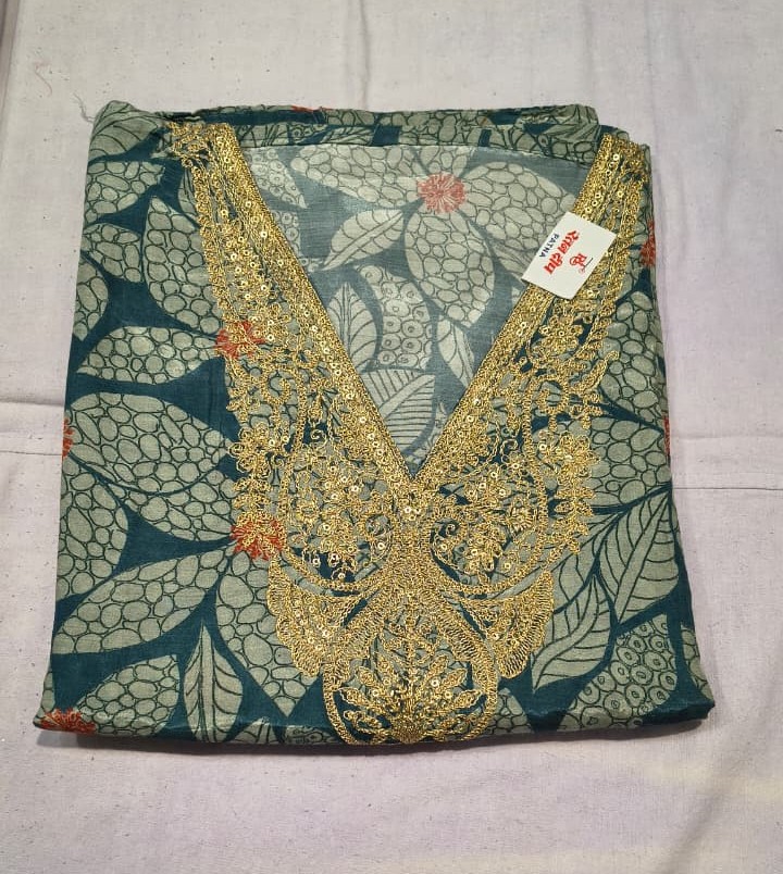 This Maslin Silk Unstitched Suit Set is a perfect blend of elegance and comfort, designed for women who love graceful ethnic wear. The suit fabric features beautiful prints enhanced with rich embroidery on the neckline, giving it a premium and festive appeal.