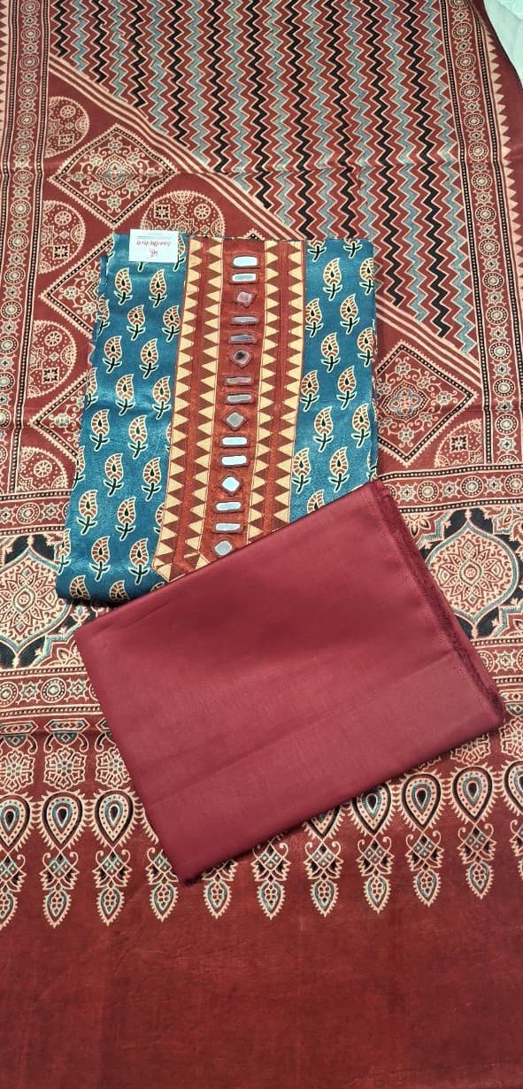 This Mushroom Cotton Ajrak Printed Suit Set beautifully reflects the richness of traditional Indian craftsmanship combined with everyday comfort. The kurta fabric is crafted from soft mushroom cotton, featuring classic Ajrak-inspired printed patterns that give the outfit a timeless ethnic appeal.