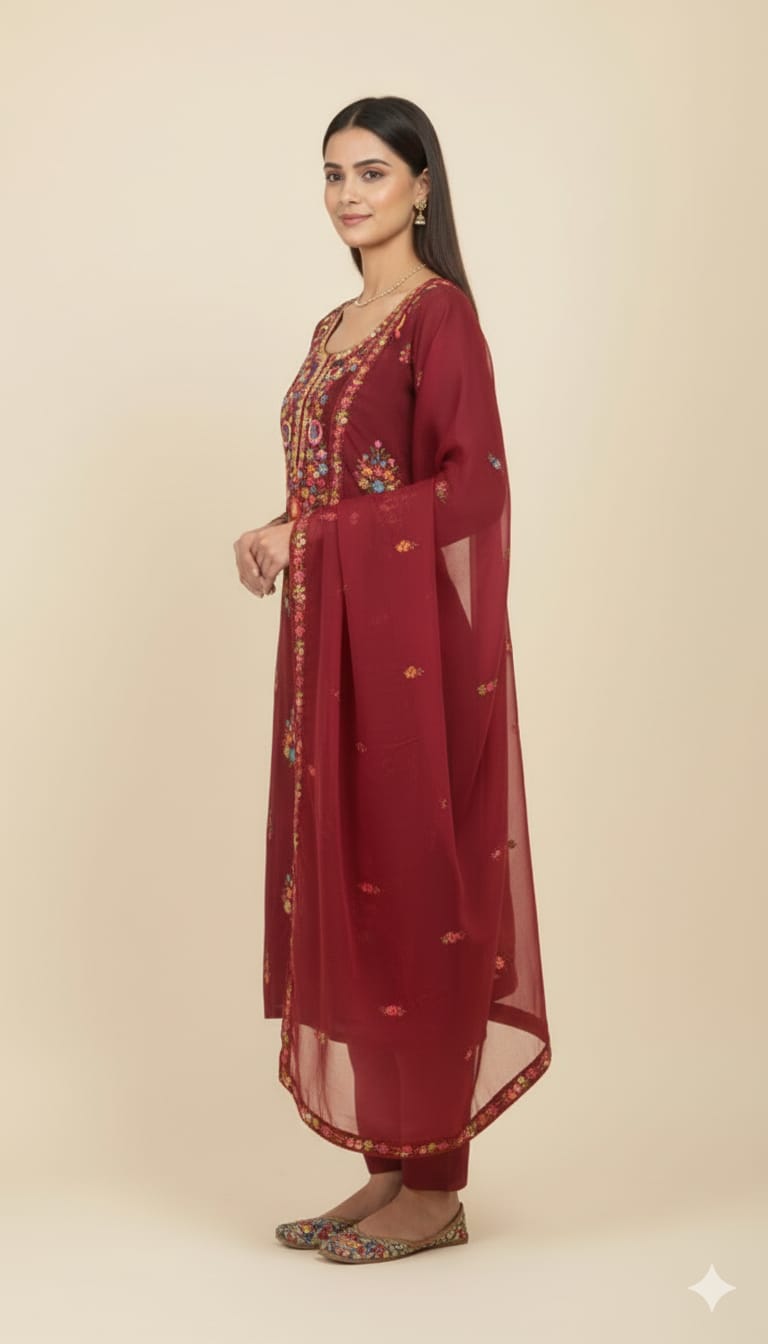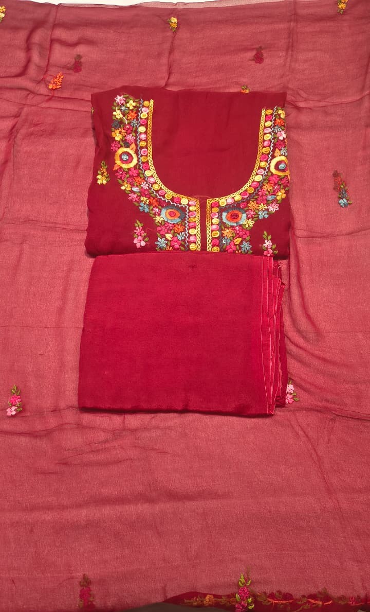 Add timeless elegance to your ethnic collection with this Phulkari Work Georgette Unstitched Suit Set. Crafted from soft georgette fabric, the kurta features beautiful traditional Phulkari embroidery, giving it a rich and graceful appeal.