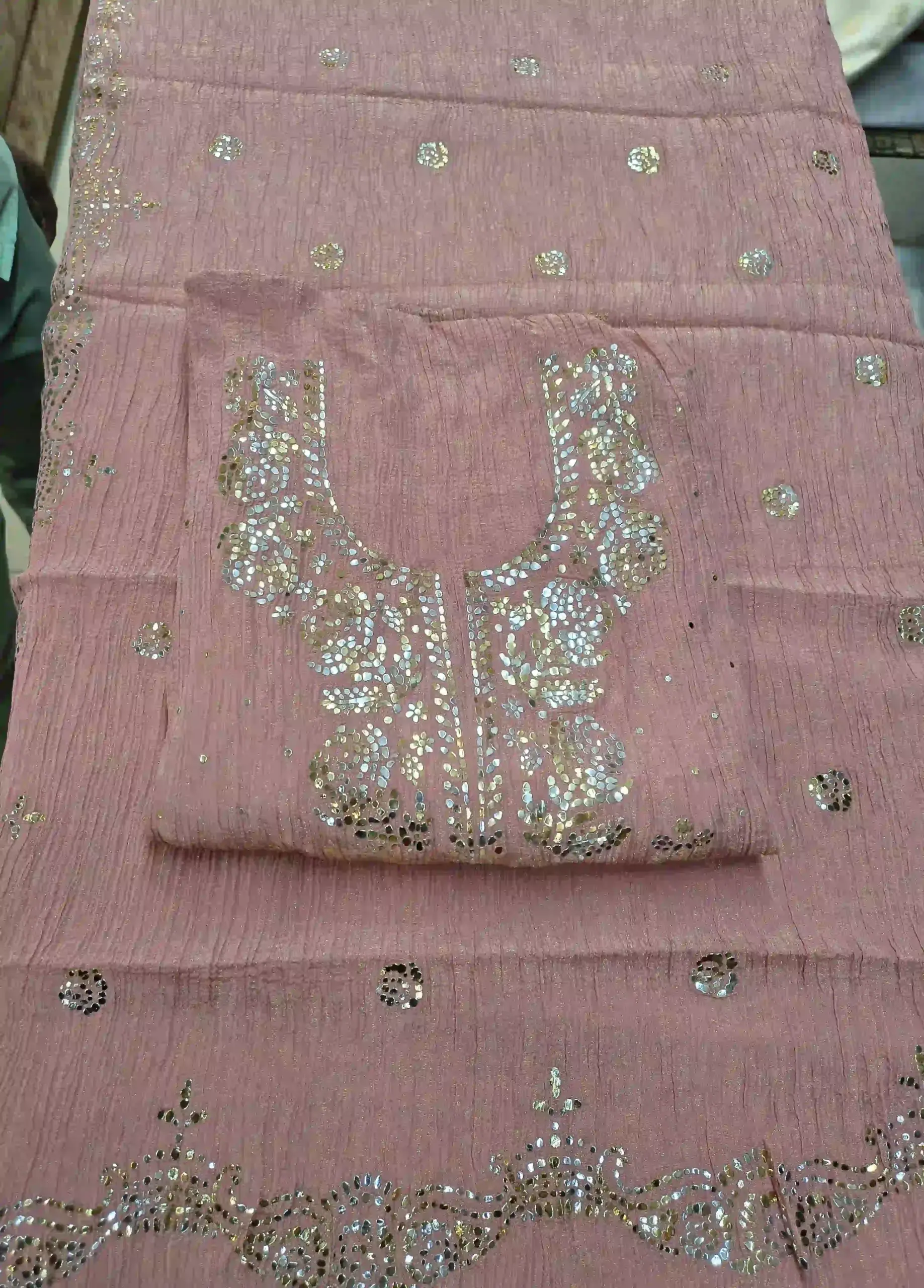 Upgrade your festive and party wardrobe with this elegant Pita Work Tissue Silk Unstitched Suit Set. Crafted from premium quality tissue silk fabric, this dress material features beautiful pita (foil) work that adds a subtle shimmer and rich look.