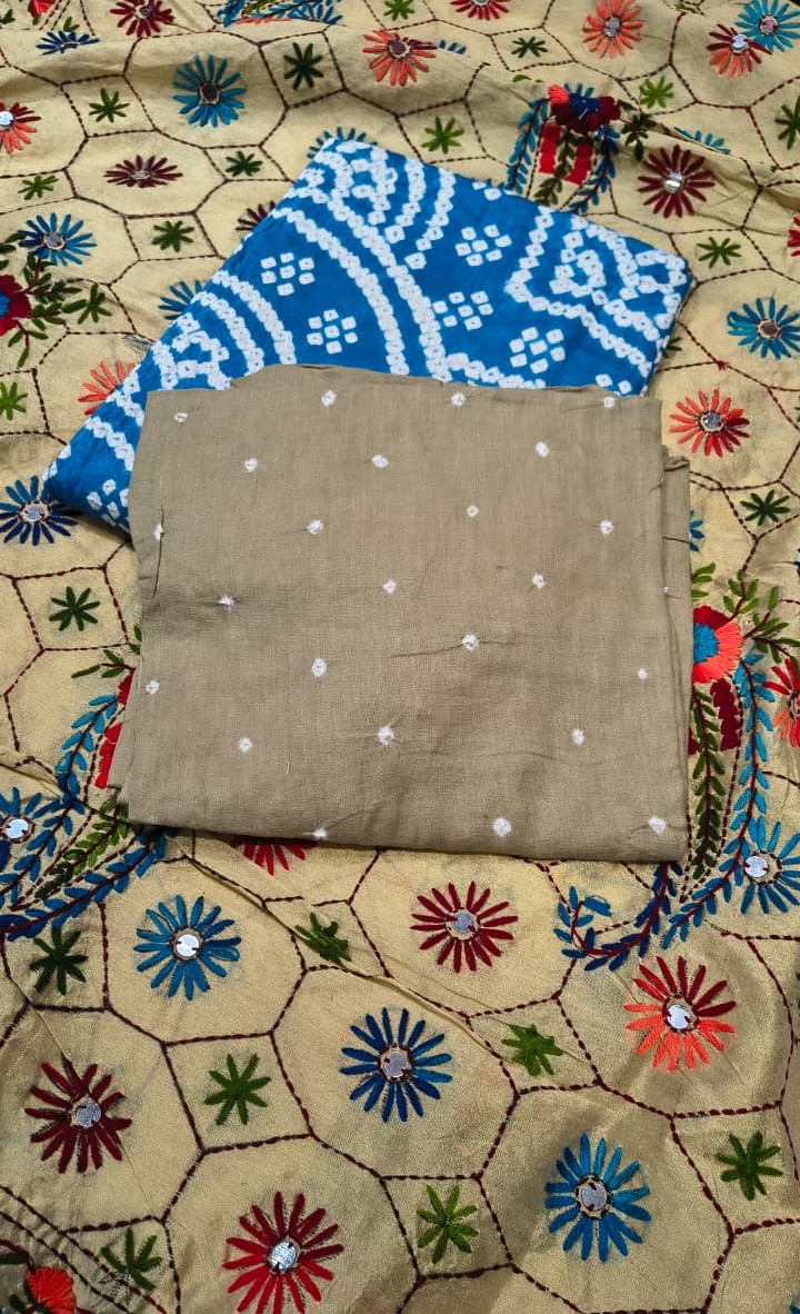 Premium Bandhani Cotton Unstitched Suit Set with Phulkari Work Dupatta and Bandhani Cotton Bottom Elegant Ethnic Wear for Festive and Casual Use