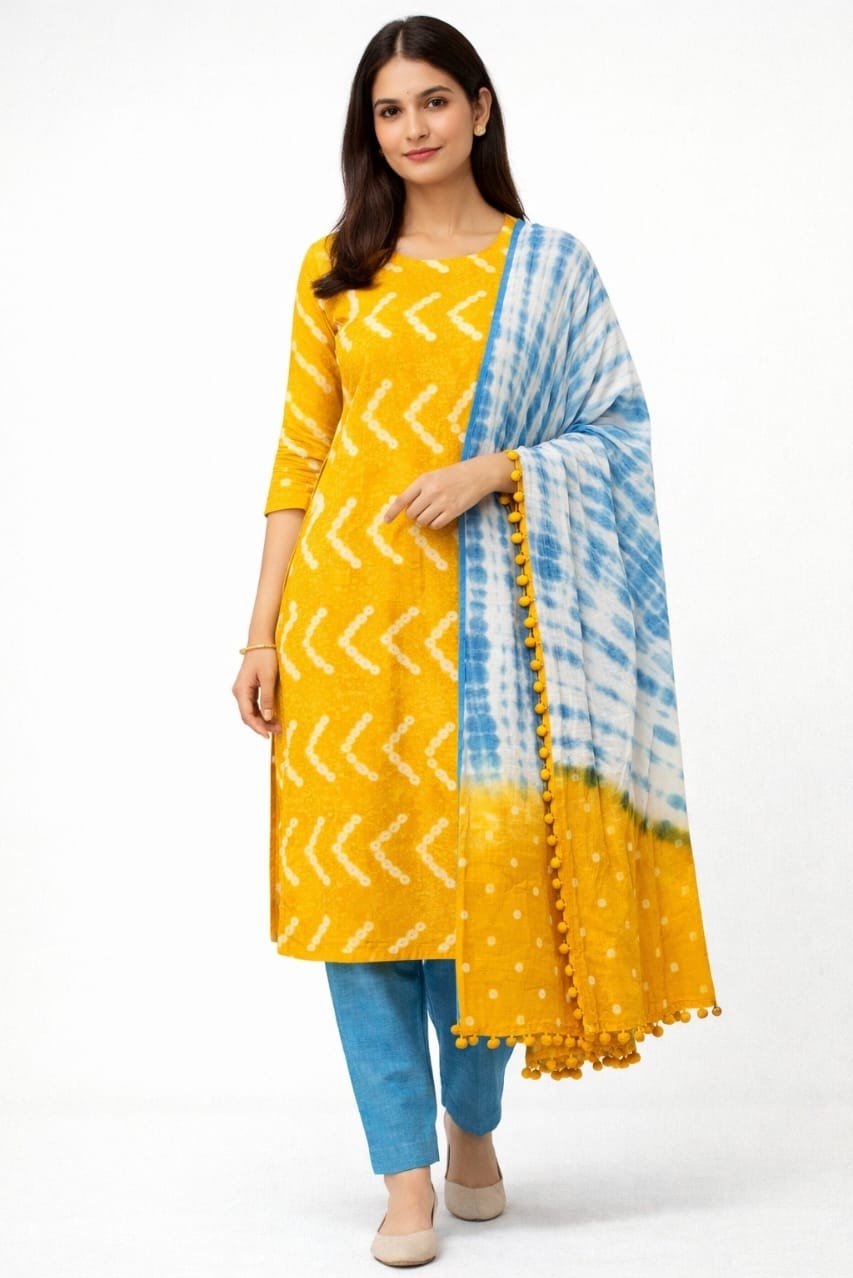 This Premium Bandhani Cotton Unstitched Suit Set is a perfect combination of traditional craftsmanship and modern comfort. The suit fabric is made from soft and breathable cotton, beautifully designed with classic Bandhani tie-dye patterns that give it a graceful and ethnic appeal. The natural texture of cotton makes it ideal for all-day wear, especially in warm weather.