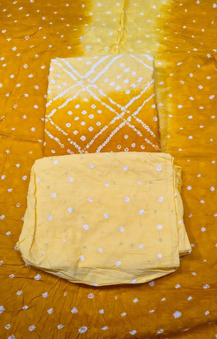 Premium Bandhani Cotton Unstitched Suit Set with Traditional Bandhej Printed Cotton Top, Matching Bandhani Cotton Dupatta and Solid Cotton Bottom Ethnic Wear