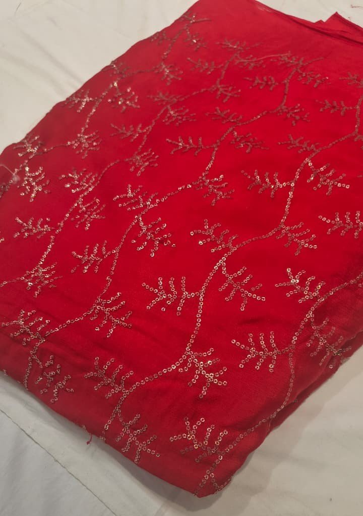 This Premium Chiffon Sequin Embroidery Fabric is designed to give a graceful and glamorous look to your ethnic and party wear outfits. Crafted on a rich red chiffon base, the fabric features delicate all-over sequin embroidery in elegant vine patterns, adding a subtle sparkle and luxurious appeal.