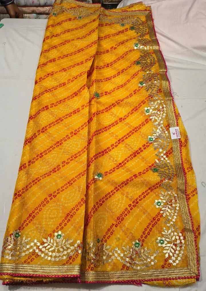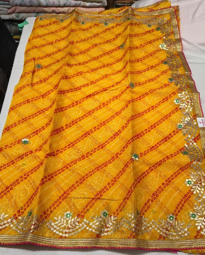 The saree is enhanced with elegant Gota Patti border detailing, adding a festive and regal touch to the overall look. The subtle shimmer of gota work perfectly complements the vibrant print, making this saree ideal for celebrations, weddings, and cultural occasions. Its airy texture and graceful drape make it suitable for both daytime and evening wear.
