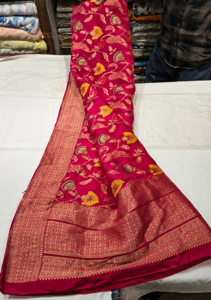 This Premium Dola Silk Multicolor Dupatta is beautifully crafted to enhance your ethnic wardrobe with elegance and traditional charm. Made from rich Dola silk fabric, this dupatta features intricate multicolor floral prints complemented by a classic zari woven border that adds a royal and festive touch.