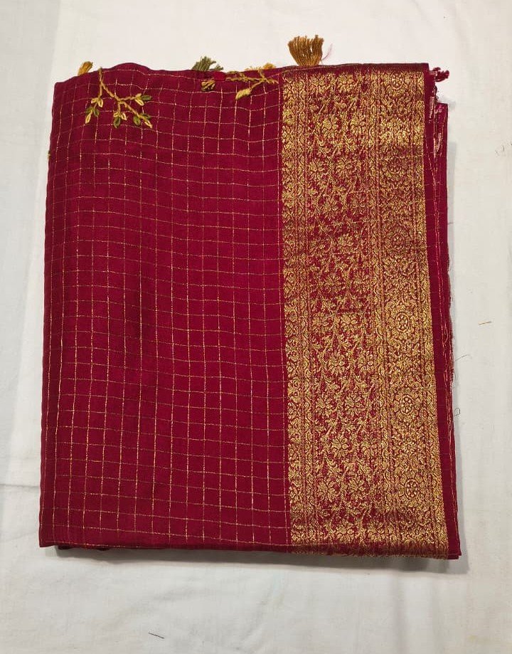 The saree is beautifully enhanced with a rich woven border and a detailed pallu showcasing handcrafted embroidery work, making it a statement piece for festive and special occasions. The natural sheen of Dola silk combined with delicate thread work gives this saree a luxurious yet comfortable feel.