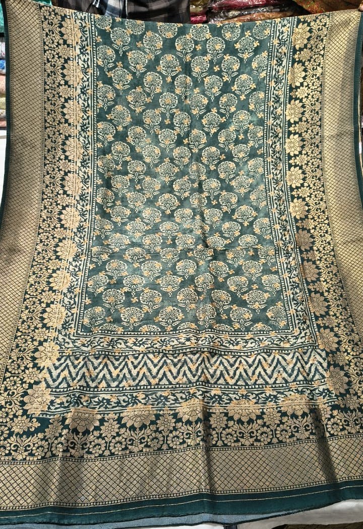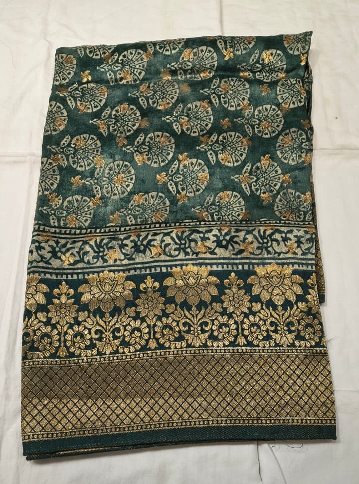 Premium Dola Silk Printed Dupatta | Elegant Green & Gold Ethnic Dupatta with Traditional Floral Design