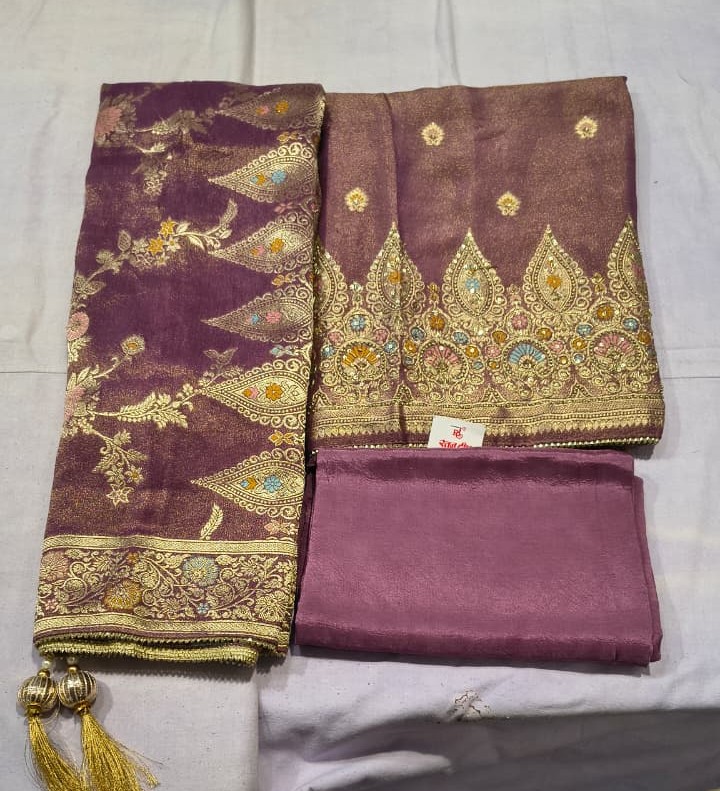 This Premium Dola Silk Suit Set is crafted for women who prefer rich ethnic elegance with a graceful finish. The suit features high quality Dola Silk fabric adorned with intricate traditional embroidery that gives a luxurious and royal appeal.