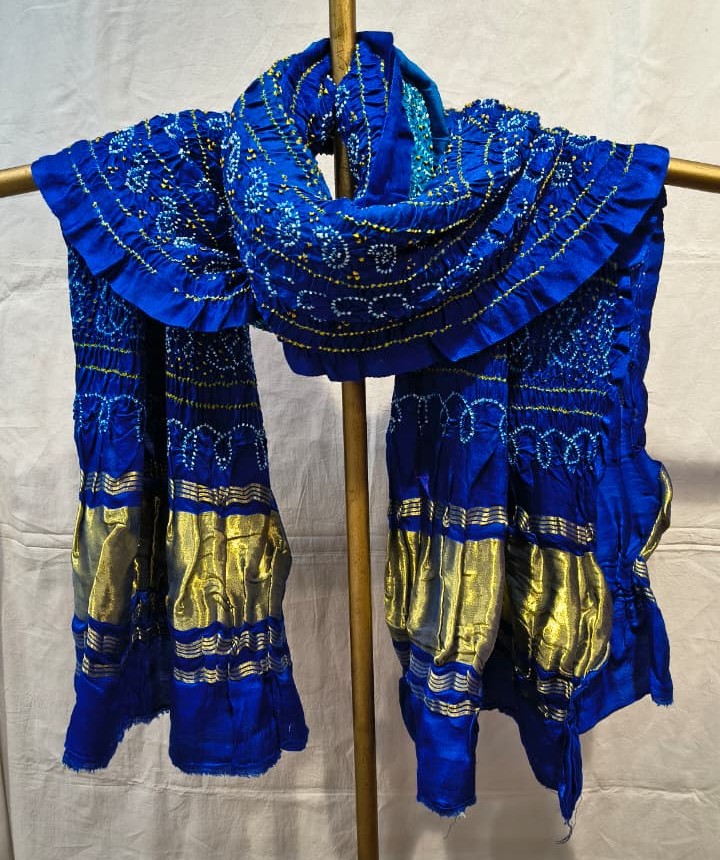 Add a royal and traditional charm to your ethnic wardrobe with this Premium Gaji Silk Gharchola Dupatta. Crafted from authentic gaji silk, this dupatta features classic Gharchola bandhej patterns enhanced with a rich golden zari border that reflects timeless Indian craftsmanship.