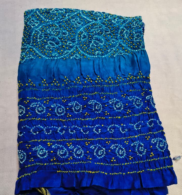 The fabric has a slightly crisp yet smooth texture, giving it a graceful fall and a luxurious festive look. The traditional checkered bandhej design makes it a perfect choice for weddings, festivals, puja functions, and special occasions. It pairs beautifully with lehenga choli, silk suits, and traditional salwar sets.