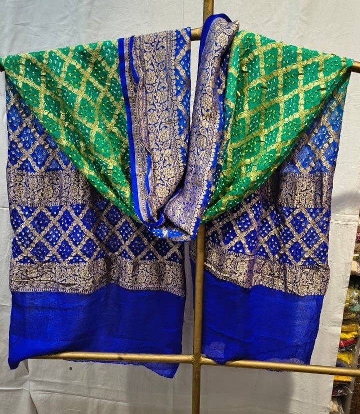 This Premium Kaddi Georgette Bandhej Dupatta beautifully blends traditional craftsmanship with elegant styling. Made from lightweight and breathable khadi georgette fabric, this dupatta features classic Bandhej (tie-dye) patterns highlighted with a rich golden zari woven border that adds a royal and festive touch.