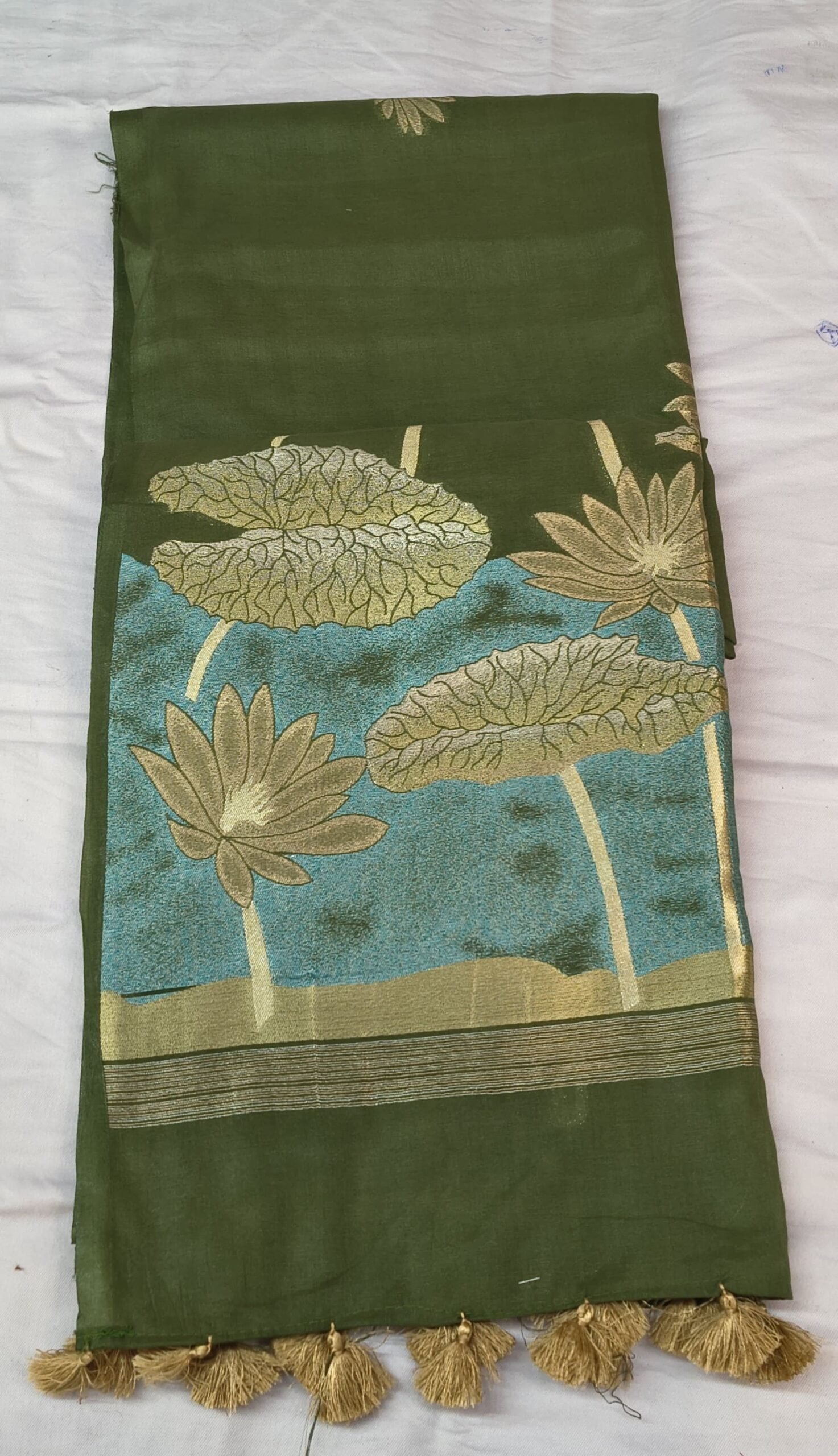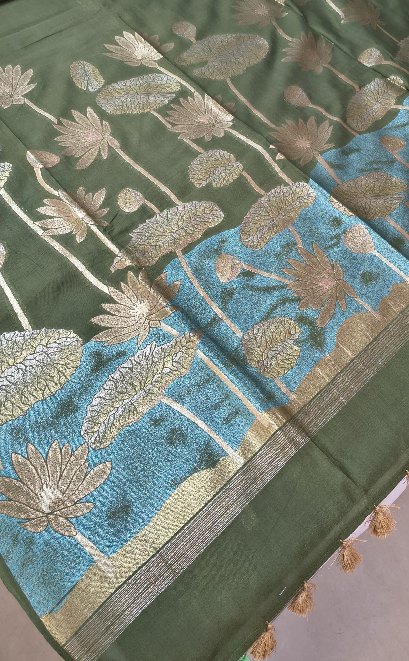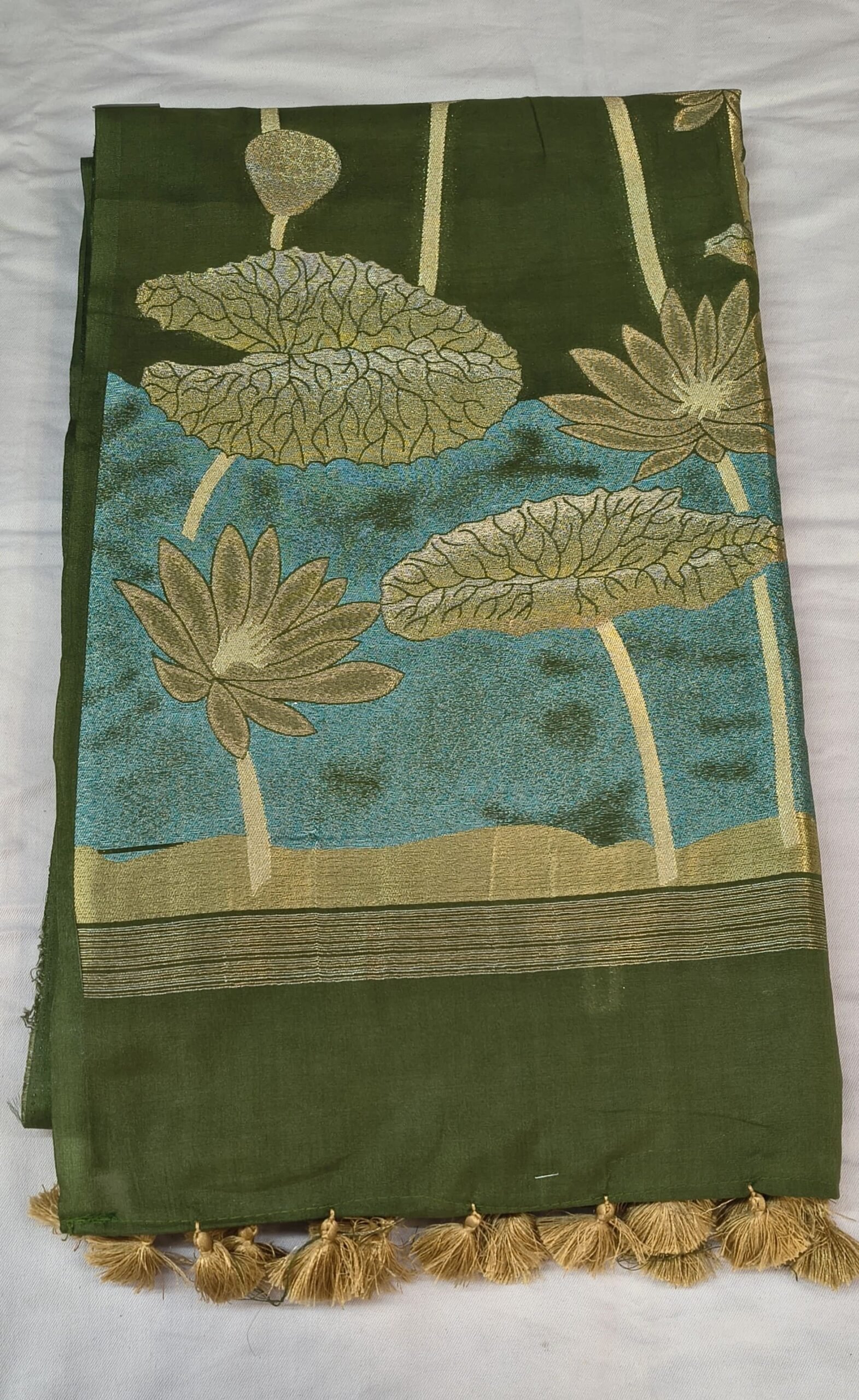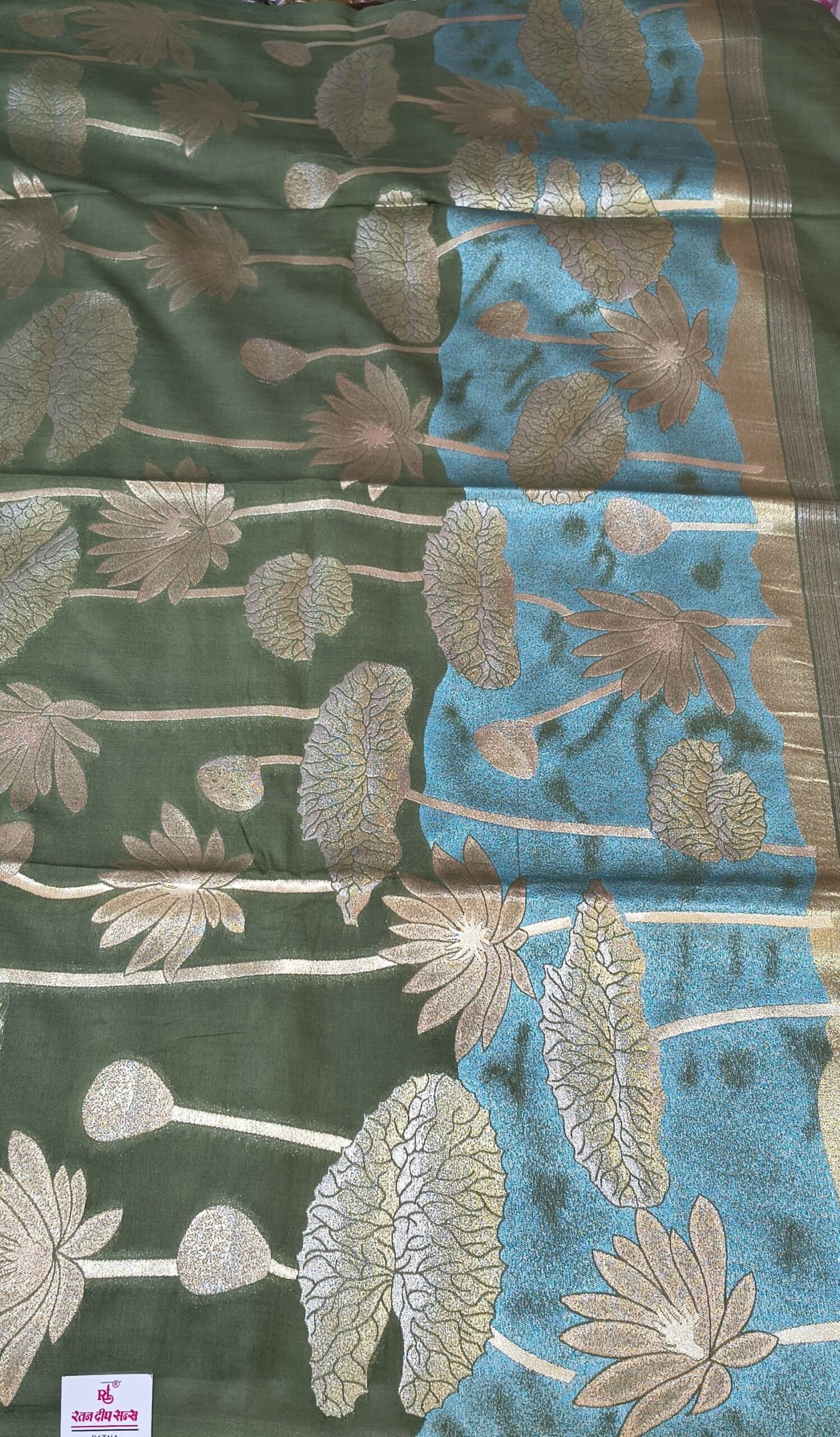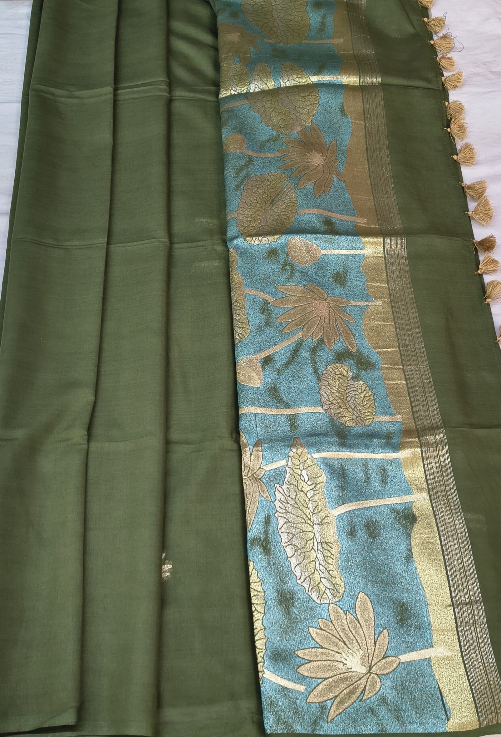 Upgrade your ethnic wardrobe with this beautiful Leeba Cotton Saree, designed with a stylish combination of green and blue tones. The saree features elegant golden floral prints that give it a rich and classy appearance.