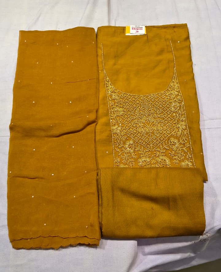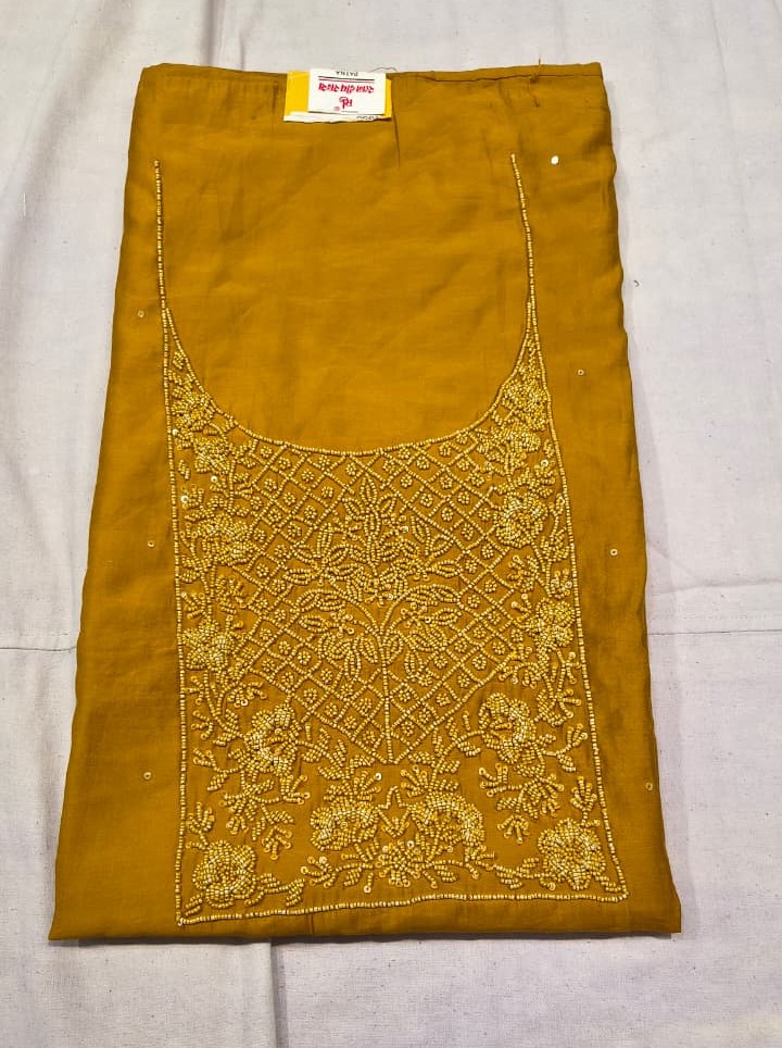 This Premium Maslin Silk Unstitched Suit Set is a perfect combination of elegance, richness, and traditional charm. The suit top is crafted from high-quality Maslin Silk and beautifully enhanced with intricate moti (bead) embroidery work on the neckline, giving it a refined and luxurious ethnic appeal.
